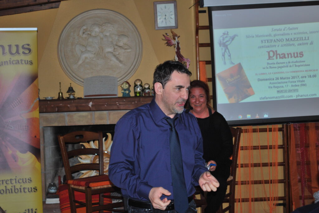 ARDEA – Il 26 marzo, nella splendida cornice della sede di Forza Vitale, Libreria dell’Anima, ha avuto luogo la presentazione di «Phanus», progetto artistico innovativo che comprende il libro, l’album cd con le canzoni e la commedia musicale. Stefano Mazzilli, l’autore, cantautore artista poliedrico, intervistato e presentato dalla giornalista e scrittrice Silvia Matricardi, ha illustrato i capisaldi della tragicomica storia di Phanus, prete eretico e rivoluzionario della Roma Papalina del XVI secolo, e delle sue esilaranti avventure alla ricerca della giustizia contro il potere oppressivo e mistificatore dell’Inquisizione .«Phanus esprime le aspirazioni profonde dell’uomo – ha detto Stefano Mazzilli – i suoi sogni, la passione per la vita autentica e per la verità, la fame di giustizia, il desiderio di unione fraterna e festosa, la nostalgia dell’amore e della bellezza». Il racconto, con il sapore della lingua originale dell’epoca, liberamente condita di romanesco goliardico, narra le avventure del protagonista e dei suoi amici, la “Compagnia de Phanus”, tra facezie, impavida passione e arguti espedienti, suscitando allegria e risate liberatorie, ma stimolando allo stesso tempo le menti a riflettere sul valore dell’impegno per il rinnovamento e della libera ricerca filosofica. Satira raffinata, dunque, per sorridere e meditare, che consegna ai posteri un messaggio di denuncia e soprattutto di speranza sempre vivo e attuale. Nel corso della serata sono state ascoltate in anteprima alcune delle canzoni dell’album e della commedia musicale, condivise attraverso una simpatica e sorprendente animazione di Stefano Mazzilli. Punto culminante della serata della serata è stata la lettura commovente del brano della commedia di Phanus riguardante il martirio di Giordano Bruno. Tutto il lavoro delle canzoni e il copione teatrale di Stefano Mazzilli è ispirato al suo stesso libro «Phanus lo skomunicatus». L’album musicale «Phanus – Storia d’amore e de rivoluzione ne la Roma papalina de l’Inquisizione» contiene 10 brani finemente arrangiati dal Maestro Luigi Mas e pubblicati da Merlinomusic Italia. Libri e musica di Stefano Mazzilli sono in vendita online su tutti i principali store, a partire da iTunes e Amazon. Per l’imminente calendario degli spettacoli in scena tenetevi aggiornati su www.stefanomazzilli.com e phanus.com!