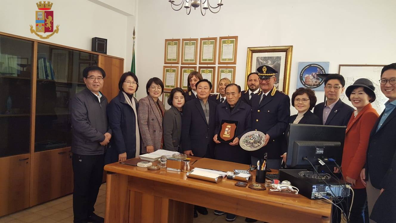 (MeridianaNotizie) Roma, 6 novembre 2018 – Stamattina alcuni rappresentanti del Municipio della città di Seul, capitale della Corea del Sud, hanno fatto visita al commissariato di Polizia “Vescovio” per uno scambio culturale e di saluti. Ad accoglierli c’era il dirigente dell’Ufficio dr. Mario Spaziani che, dopo un amichevole scambio di doni con il Presidente del Municipio di Suel, Yim Tae Gun, ha risposto alle numerose domande a lui rivolte sulla tipologia di lavoro svolto quotidianamente dai poliziotti. La delegazione ha apprezzato la professionalità e la cordialità manifestata dagli agenti della Polizia di Stato.