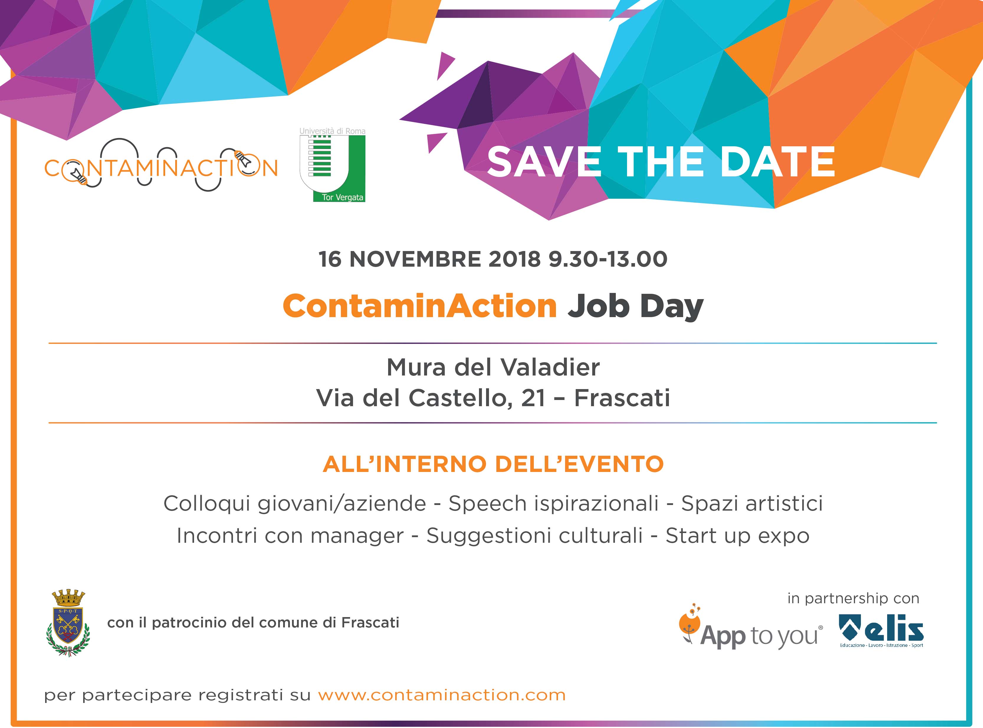 (MeridianaNotizie) Roma, 7 novembre 2018 – Venerdì 16 novembre 2018 dalle ore 9.30 alle 13.00 nella splendida cornice delle Mura del Valadier, in Via del Castello 21, l’Amministrazione comunale presenta il ContaminAction Job Day, un grande evento finalizzato all’incontro con le aziende, che si terrà in pieno stile ContaminAction, format già consolidato che agevola lo scambio interattivo tra domanda e offerta di lavoro. «Il Job Day sarà un momento di grande impatto, aperto non solo ai giovani disoccupati, ma anche a tutti coloro che intendono rientrare nel mondo del lavoro – dichiara l’Assessore alle Politiche Sociali Alessia De Carli -. Invito pertanto tutte le persone che cercano una concreta opportunità professionale ad iscriversi e a partecipare al Job Day. Questa sarà la prima di una serie di giornate dedicate al recruitment. Ringrazio la delegata alla Scuola Paola Gizzi per aver aderito all’iniziativa, coinvolgendo le scuole del territorio in questa interessante giornata di orientamento e formazione. Ringrazio anche Giuseppe Calicchia della Elis.org primo promotore di questa giornata dedicata al lavoro». «La cosa bella è che all’evento parteciperanno numerose imprese che si presenteranno ai giovani per far conoscere nel dettaglio le opportunità di lavoro e per spiegare le loro reali esigenze – dichiara il Sindaco Roberto Mastrosanti -. Mi sembra il modo migliore per avviare un dialogo costruttivo con i responsabili delle risorse umane, che consentirà ai partecipanti di riflettere sulle scelte da intraprendere per entrare nel mondo del lavoro e per ricollocarsi, conoscendo quelli che sono i trend professionali di assunzione del personale». «Partecipando al Job Day i ragazzi potranno vedersi riconosciuta una giornata di alternanza Scuola Lavoro – dichiara la Delegata alla Scuola Paola Gizzi -. Ritengo sia questa una strada più proficua per un efficace integrazione tra le varie istituzioni». La giornata, patrocinata dal Comune di Frascati, sarà organizzata dalla ContaminAction Tor Vergata University, che forma e inserisce i giovani in azienda sulle professioni più richieste, in partnership con App to you, Centro ELIS e Funzione innovatori civili.  All’interno dell’evento, che si avvarrà di spazi artistici e suggestioni culturali, sono previsti anche momenti di formazione per i ragazzi su diversi temi, tra cui come scrivere un cv, affrontare un colloquio di selezione o impostare un profilo social per l’inserimento nel mondo del lavoro. L’ingresso è gratuito fino ad esaurimento posti. Per info e prenotazioni: www.contaminaction.com