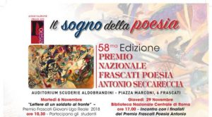 (MeridianaNotizie) Roma, 30 novembre 2018 – Siamo ormai in prossimità della cerimonia conclusiva che decreterà il 58° vincitore del Premio Nazionale Frascati Poesia Antonio Seccareccia, che ha attraversato, nella sua lunga storia, il meglio della poesia: da Alberto Bevilacqua ad Alfonso Gatto, da Vittorio Bodini a Raphael Alberti, da Giorgio Vigolo a Francesco Tentori, da Andrea Zanzotto a Valerio Magrelli, Roberto Deidier e in ultimo Davide Rondoni. Non è un caso che il titolo generale di questa edizione sia il “Sogno della poesia”. Qualcosa che non è un idillio retorico, né l’enfasi di una divagazione. Ma ancora una volta un “sogno vero e reale”: quello che dichiara la letteratura e lo studio sono i cardini essenziali per vivere la vita, le sue fatiche, le sue contraddizioni. “Frascati può davvero fregiarsi anche del titolo di Città della Poesia. Lo dimostra il suo Premio nazionale, intitolato a Antonio Seccareccia, che da 58 edizioni porta nella nostra Città grandi autori, letterati e poeti, trasformando Frascati in un vero e proprio crocevia della letteratura – dichiara il Sindaco di Frascati Roberto Mastrosanti -. Sarà l’occasione di accostarsi a tre differenti voci contemporanee, tre maniere diverse di raccontare l’uomo, le passioni e le emozioni. La poesia un tempo ritenut