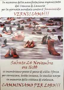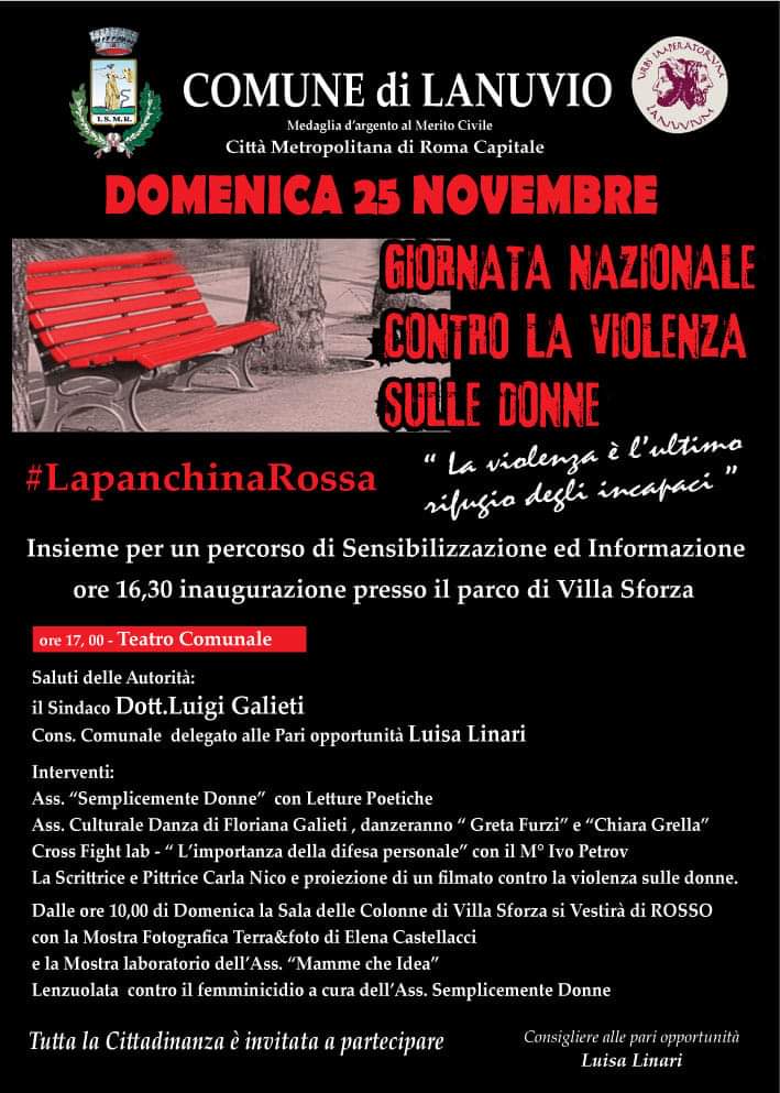 (MeridianaNotizie) Roma, 21 novembre 2018 – Domenica 25 novembre in occasione della Giornata Nazionale contro la Violenza sulle Donne, il Comune di Lanuvio organizza delle iniziative per l’eliminazione della violenza contro le donne. La Giornata Mondiale contro la Violenza sulle Donne è stata istituita il 17 dicembre 1999 dall’Assemblea Generale delle Nazioni Unite. In ogni continente del globo saranno organizzati eventi per riflettere su una piaga che presenta risvolti drammatici: basti pensare che nei primi mesi del 2018 in Italia sono state uccise già 44 donne, il 30% in più rispetto allo stesso periodo del 2017. Per non far calare l’attenzione su questa tragedia molte amministrazioni comunali aderiscono alla ricorrenza per contrastare questo fenomeno e promuovere un profondo cambiamento culturale. Il Comune dei Castelli Romani aderisce alla Giornata attraverso due eventi. Il primo, sabato 24 novembre, alle ore 16, presso il Parco di Villa Sforza, organizzando una manifestazione in onore delle donne vittime di violenza. Ci si incontrerà tutte insieme per verniciare le vecchie scarpe in memoria del femminicidio. Il secondo evento, nella giornata del 25 novembre, dalle ore 10 la Sala delle Colonne di Villa Sforza si vestirà di rosso con la mostra fotografica Terra&Foto di Elena Castellacci e la mostra laboratorio dell’Associazione “Mamme che Idea”. Dalle ore 16,30 si svolgerà sempre presso il Parco di Villa Sforza, un percorso di sensibilizzazione ed informazione al femminicidio e alla violenza contro le donne. Seguiranno alle ore 17, presso il Teatro Comunale di Lanuvio una serie di interventi da: