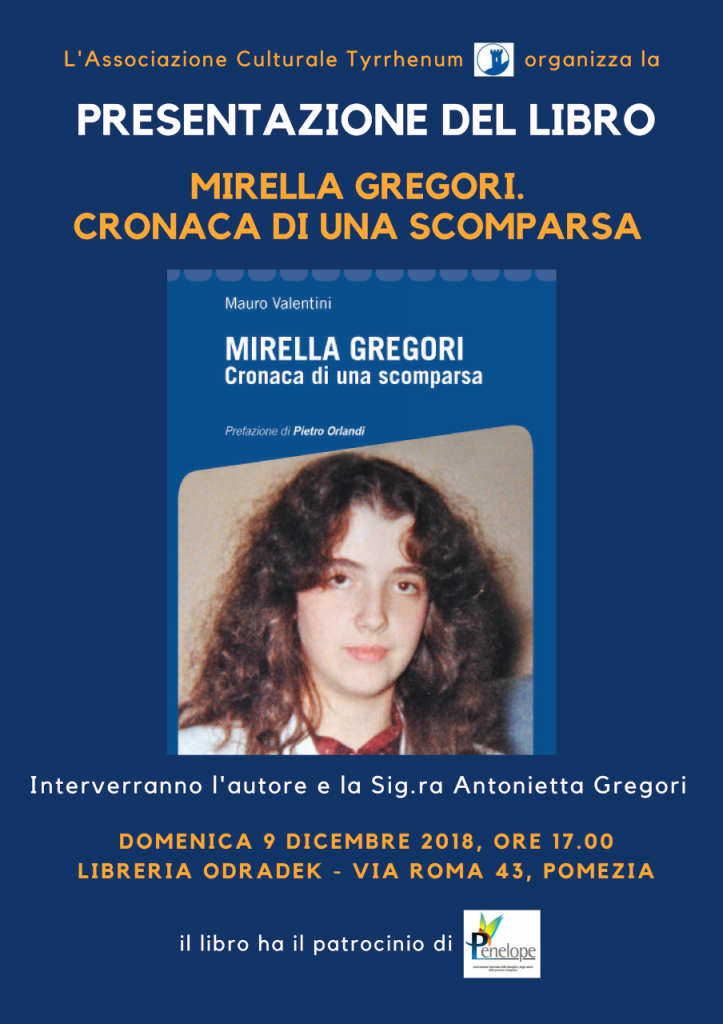 (MeridianaNotizie) Pomezia, 26 novembre 2018 – Domenica 9 dicembre 2018, alle ore 17.00, presso la libreria “Odradek” a Pomezia in via Roma 43, l’Associazione Culturale Tyrrhenum organizza la presentazione del libro “Mirella Gregori. Cronaca di una scomparsa”. Interverranno l’autore, il giornalista Mauro Valentini, e la signora Maria Antonietta Gregori, la sorella della giovane scomparsa, in circostanze purtroppo ancora misteriose, il 7 maggio del 1983. Il libro ha il patrocinio di Penelope Italia, Associazione nazionale delle famiglie e degli amici delle persone scomparse onlus. In allegato la locandina dell’evento e la sinossi del libro, oltre a maggiori informazioni sull’autore.