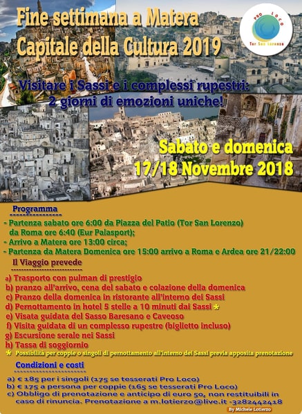(MeridianaNotizie) Ardea, 5 novembre 2018 – Sabato 17 novembre la Pro Loco Tor San Lorenzo organizza un fantastico  fine settimana a Matera,  con pernottamento all’interno della Capitale della Cultura 2019.