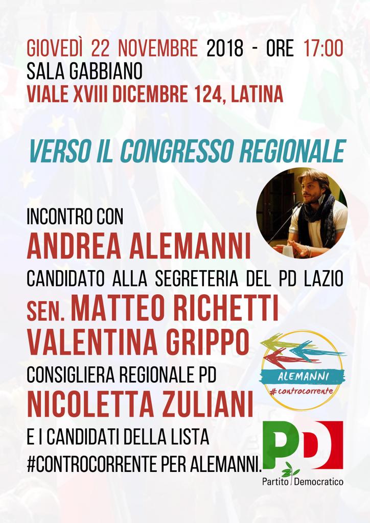 L’appuntamento con le persone che vogliono sostenere la candidatura di Andrea Alemanni, o, più semplicemente lo vogliono conoscere ed ascoltare, è per giovedì 22 novembre dalle 17,00 in poi presso la sala “Il Gabbiano” a Latina in V.le XVIII Dicembre 124. Parteciperanno, oltre al candidato alla segreteria regionale, il senatore Matteo Richetti e la Consigliera regionale Valentina Grippo, che, con Nicoletta Zuliani e gli altri candidati nella lista “controcorrente” si confronteranno con simpatizzanti e cittadini sui temi del rinnovamento della politica e delle nuove prospettive di un PD , capace di ascoltare, aperto ed al passo con i tempi.