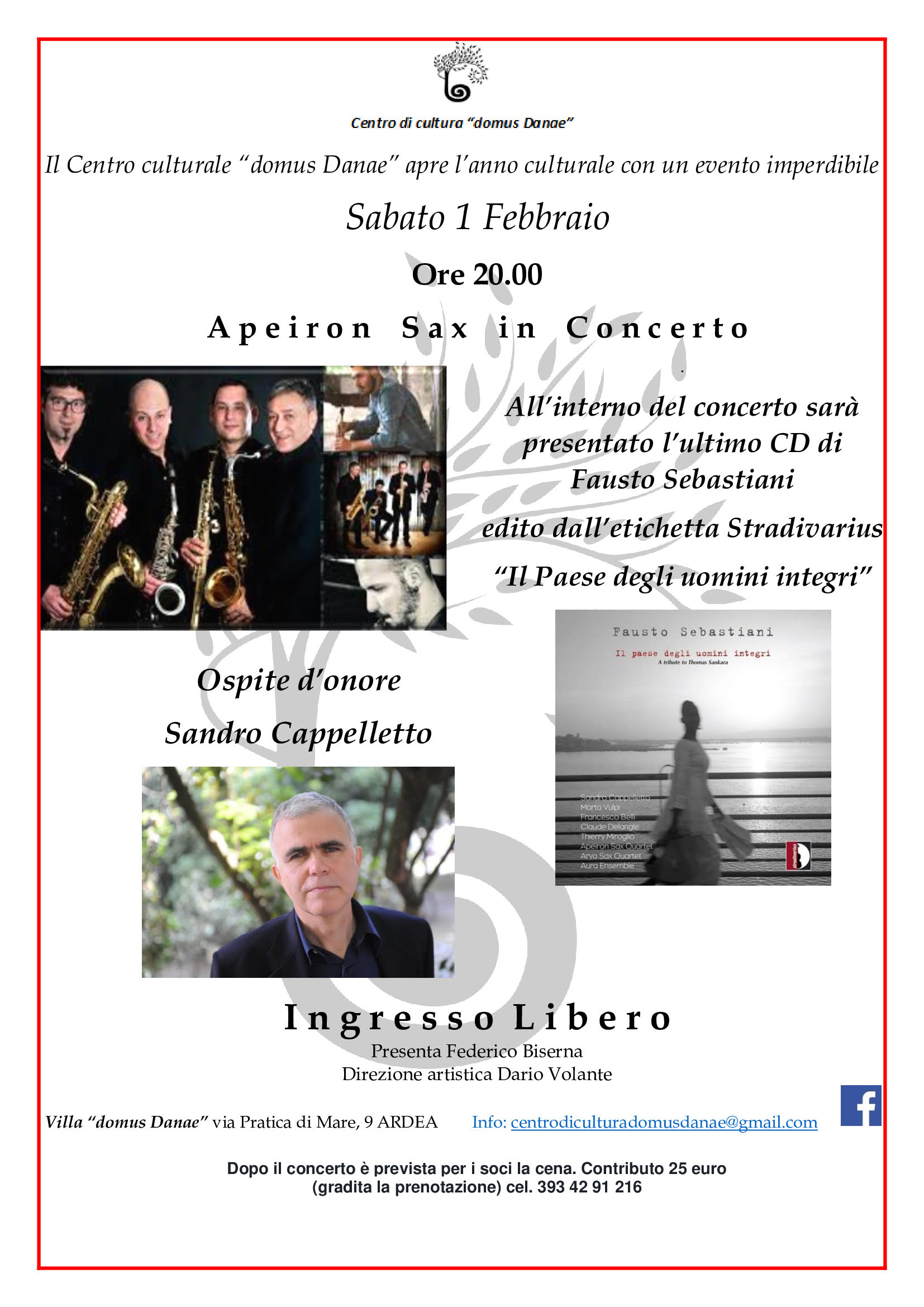 (Meridiananotizie) Ardea, 28 gennaio 2020 – Il Centro di cultura domus Danae apre la stagione culturale con un emozionante concerto degli Apeiron Sax assolutamente da non perdere. Durante il concerto sarà presentato anche il nuovo CD Stradivarius “Il paese degli uomini integri” di Fausto Sebastiani.