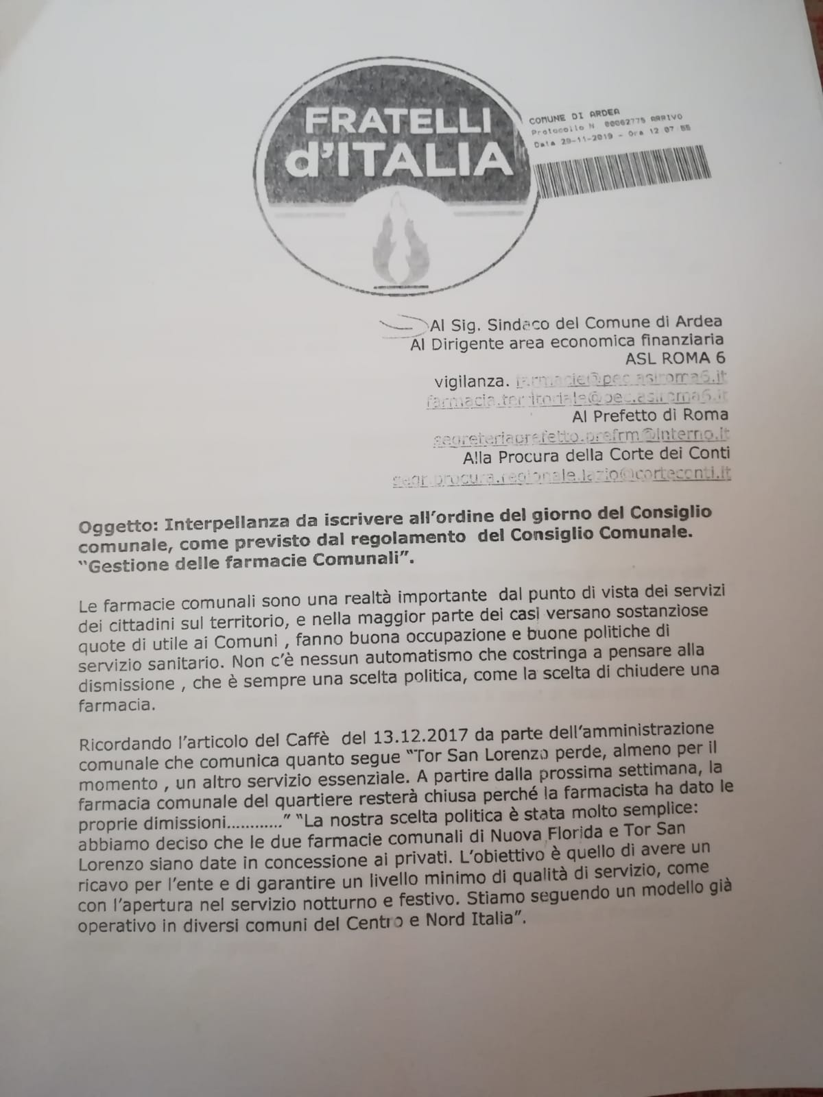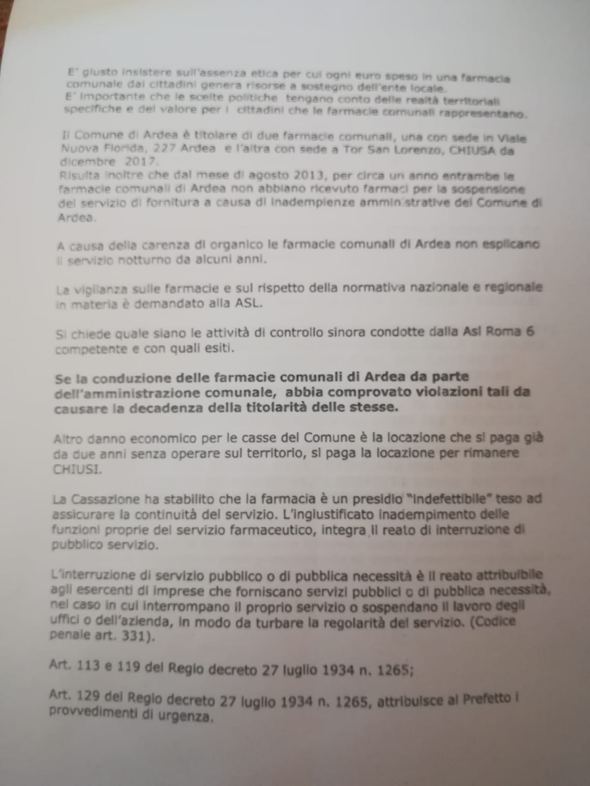 “La mia preoccupazione si accentra poi sui  canoni di locazione pagati per   anni a fondo perduto,  con un danno alle casse economico-finanziarie  del comune di Ardea,  in quanto la farmacia comunale di Tor San Lorenzo è stata chiusa da questa amministrazione pentastellata a dicembre 2017, non ha più  prestato  un servizio alla cittadinanza , si pagavano i canoni di locazione per rimanere chiusi”.