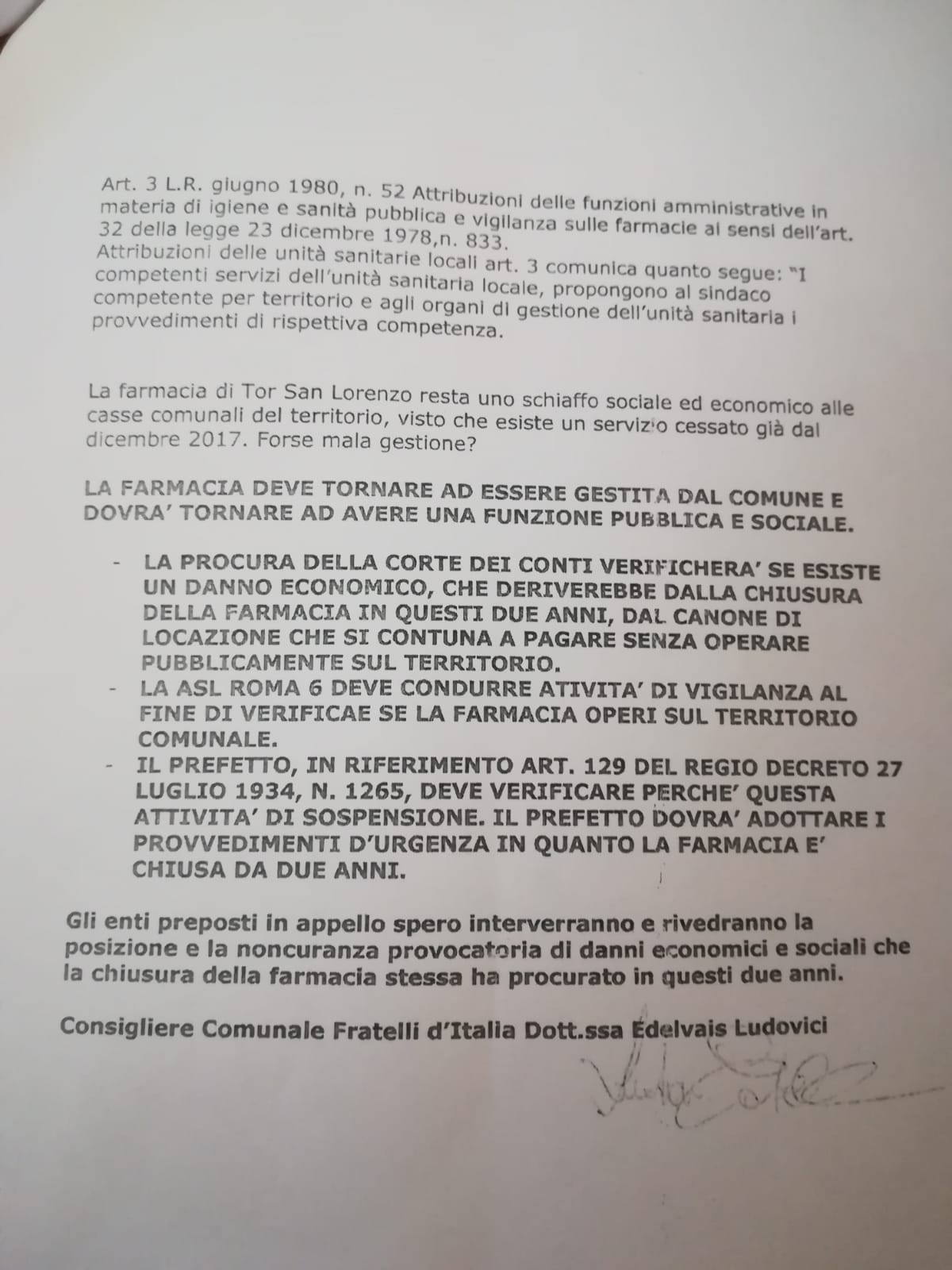 Sono andata avanti e il 29 novembre 2019 prot. N. 62775, ho presentato l’ennesima interpellanza all’amministrazione comunale e  a tutte le autorità preposte in materia , alla vigilanza delle farmacie comunali Asl Roma 6 (clicca qui pag_1 Pag_2 Pag_3)”.