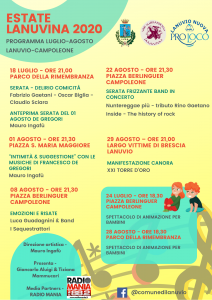(MeridianaNotizie) Lanuvio, 14 luglio 2020 – Musica, comicità,spettacoli per adulti e bambini: sono questi gli ingredienti dell’Estate Lanuvina 2020 organizzata dal Comune di Lanuvio e dalla Lanuvio Nuova Pro Loco .La kermesse, con la direzione artistica affidata a Mauro Ingafù, prenderà il via il 18 luglio e si concluderà il 28 agosto. Esprimono soddisfazione l’Assessore alla Cultura Alessandro De Santis e l’Assessore al Turismo Valeria Viglietti : “Nonostante l’emergenza Covid ancora in corso, siamo lieti di poter offrire alla Cittadinanza e ai turisti, una serie di appuntamenti estivi di livello in piena sicurezza”. In allegato il cartellone completo delle iniziative.