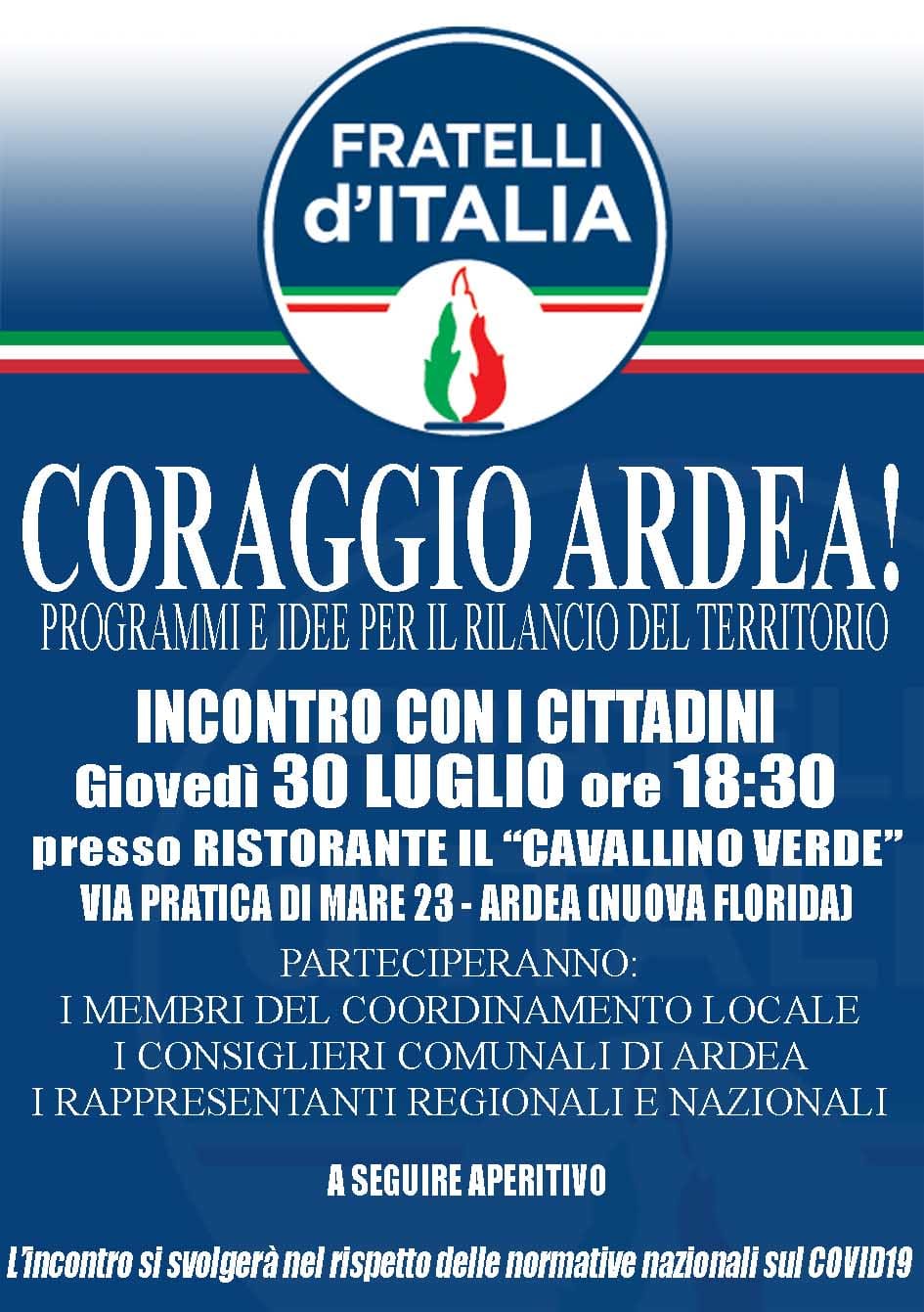 (Meridiananotizie) Ardea, 30 luglio 2020 – Questo pomeriggio il gruppo Consiliare di Fratelli d’Italia di Ardea ha indetto una riunione pubblica nel Comune rutulo (clicca qui), con inizio alle ore 18.30 presso il “Cavallino Verde” – via pratica di mare 23, nella quale incontrerà i cittadini, nel rispetto, naturalmente, delle normative nazionali sul Covid-19, per enunciare programmi ed idee per il rilancio del territorio.