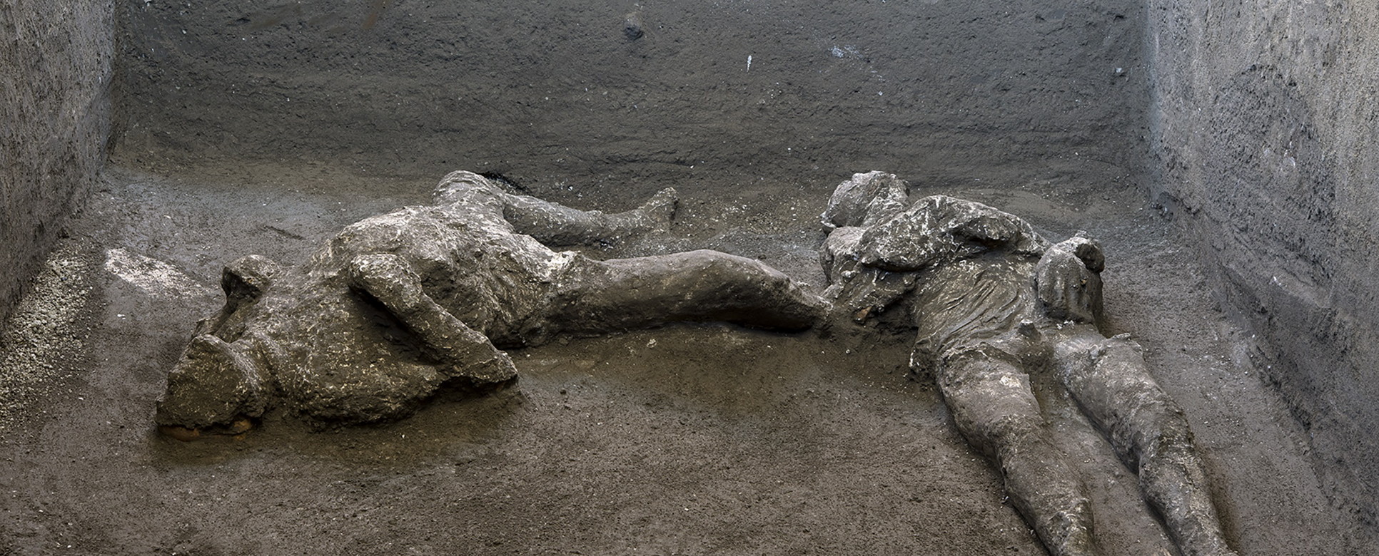 Durante la prima fase eruttiva, quando l’antica città romana venne ricoperta dai lapilli, le prime vittime furono quelle intrappolate negli ambienti, investite dai crolli provocati dal materiale vulcanico depositatosi fino a un’altezza di tre metri. Di queste persone sono rimasti soltanto gli scheletri. Poco dopo, quando la città venne colpita dal flusso piroclastico che riempì gli spazi non ancora invasi dai materiali vulcanici, le persone morirono all’istante per shock termico. I corpi rimasero nella posizione in cui erano stati investiti dal flusso, e il materiale cineritico solidificatosi ne ha conservato l’impronta dopo la decomposizione. Proprio questo è successo ai due pompeiani da poco rivenuti nella villa suburbana del Sauro Bardato a Civita Giuliana, dove uno scavo in corso dal 2017 ha riportato alla luce i resti di una lussuosa abitazione che, con una grande terrazza panoramica, dominava il Golfo di Napoli e di Capri.