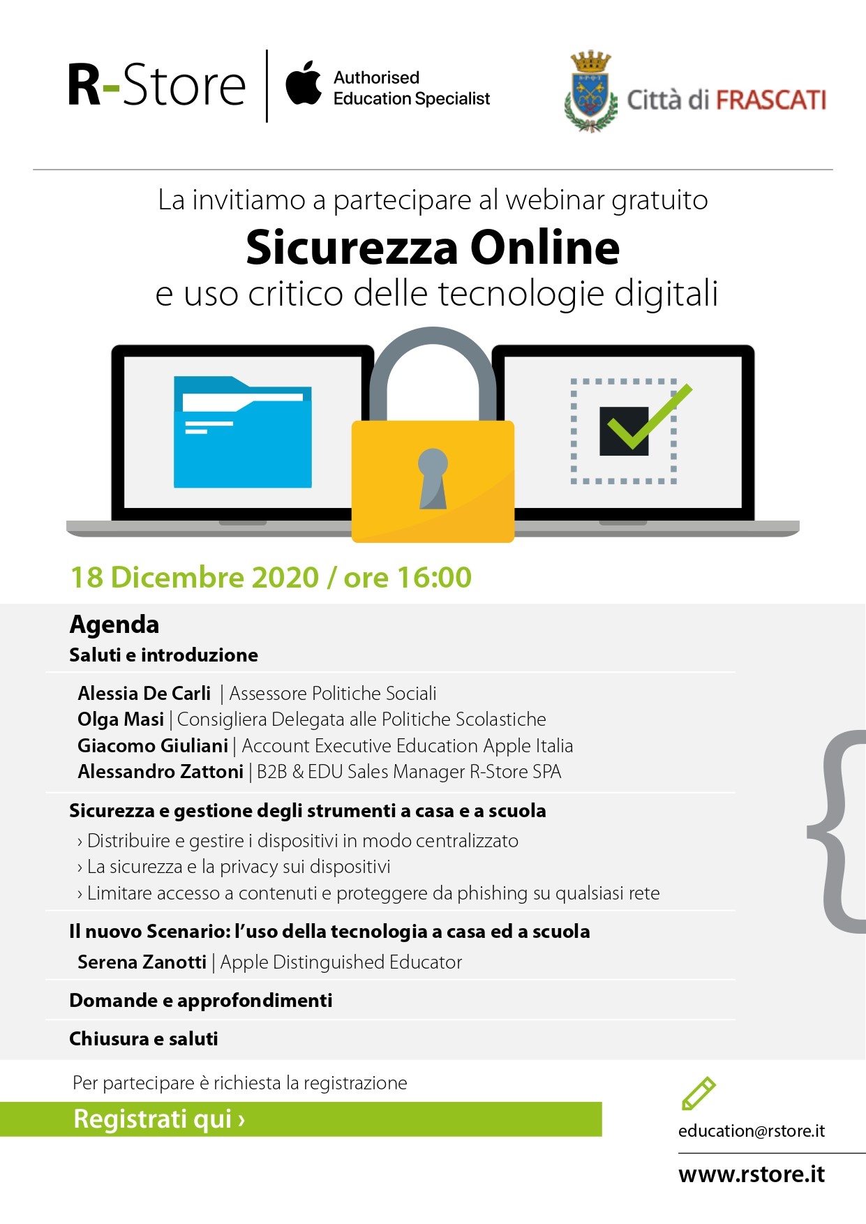 Partecipano al webinar: Alessia De Carli, Assessore alle Politiche Sociali del Comune di Frascati, Olga Masi, Consigliera Delegata alle Politiche Scolastiche, Giacomo Giuliani, Account Executive Education Apple Italia, Alessandro Zattoni, EDU Sales Manager di R-Store.