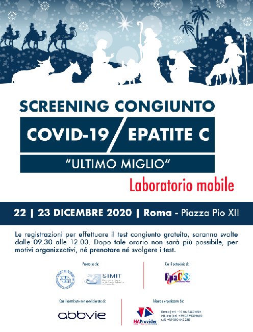 (MeridianaNotizie) Roma, 22 dicembre 2020 –  Oggi e domani, in piazza Pio XII a Roma, operativo il laboratorio mobile promosso da AISF (Associazione Italiana per lo Studio del Fegato) e SIMIT (Società Italiana di Malattie Infettive e Tropicali) con il patrocinio dell’Associazione Pazienti “EpaC Onlus” 21 dicembre – Il roadshow con test sierologico congiunto Covid 19 – Epatite C torna nel Lazio per l’ultimo miglio verso lo screening nazionale gratuito di 17 milioni di cittadini che servirà ad eradicare l’Epatite C entro il 2030 in Italia.