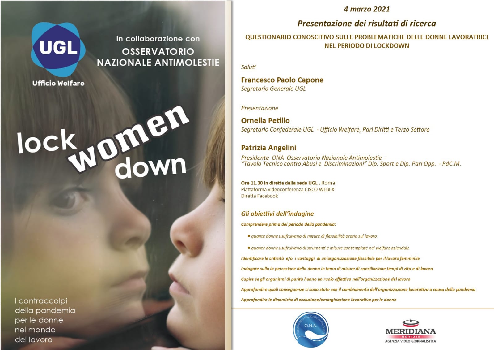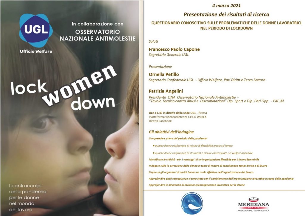(MeridianaNotizie) Giovedì 4 marzo 2021 alle ore 11.30 dalla sede Confederale dell’UGL a Roma e in diretta sulla pagina Facebook Ugl Confederazione e su quella dell’Agenzia di Stampa MeridianaNotizie,si terrà la presentazione dei risultati di ricerca “QUESTIONARIO CONOSCITIVO SULLE PROBLEMATICHE DELLE DONNE LAVORATRICI NEL PERIODO DI LOCKDOWN”. Al Segretario Generale dell’UGL, Francesco Paolo Capone, spettano i saluti, mentre la presentazione dell’esito del monitoraggio sarà illustrata da Ornella Petillo, Segretario Confederale Responsabile Ufficio Welfare UGL, e Patrizia Angelini, Presidente ONA Osservatorio Nazionale Antimolestie – “Tavolo Tecnico contro Abusi e Discriminazioni” Dip. Sport e Dip. Pari Opp. PdC.M.