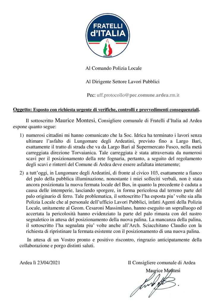 “Inoltre, molti di questi interventi – aggiunge Montesi – sono di competenza delle aziende appaltatrici che hanno in carico lo sviluppo e la manutenzione delle utenze nel territorio di Ardea. E’ il caso della Società “IDRICA Spa” che, come da regolamento comunale, ha l’onere di ripristinare metà carreggiata dell’asfalto stradale in tutta la lunghezza delle aree interessate dagli scavi per il posizionamento della rete idrica. Sul lungomare degli Ardeatini – continua il Consigliere Montesi – ancora una volta, a seguito di istanze dei cittadini che  sono pervenute presso la mia segreteria, devo constatare che nulla è stato fatto nonostante avessi più volte sollecitato al Comune lo stato disagiato dei luoghi. A tal proposito – conclude Montesi – ho inoltrato di nuovo al Comune l’ennesima mia richiesta di intervento urgente (clicca qui) al fine di ripristinare il manto stradale nonché altre situazioni già segnalate in passato che mettono in pericolo il transito sul Lungomare degli Ardeatini, sia con mezzi carrabili che a piedi”.