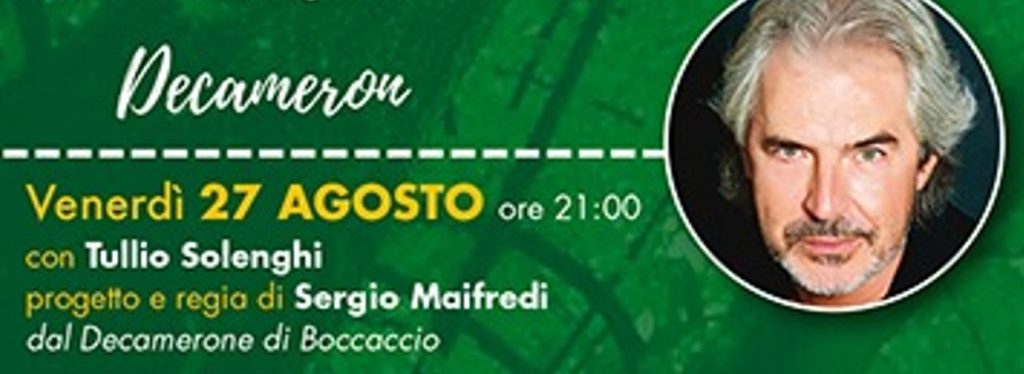 Venerdi 27 agosto alle 21 Tullio Solenghi va in scena con “Decameron, un racconto italiano in tempo di peste”, spettacolo ideato e diretto da Sergio Maifredi e che è tratto dal “Decamerone”. Nel corso dellarappresentazione, Solenghi restituisce la lingua originale di Giovanni Boccaccio rendendola accessibile e comprensibile come fosse la lingua di un testo contemporaneo.