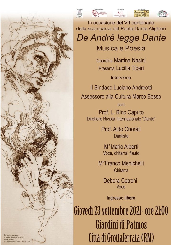 Giovedì 23 settembre 2021 alle 21,00 presso i Giardini di Patmos a Grottaferrata (ingresso via Garibaldi con green pass e mascherina obbligatori), l’associazione culturale La Terzina, in partenariato con la Città di Grottaferrata, presentano De André legge Dante. Musica e poesia, serata evento nel corso della quale la poesia del Sommo Poeta si mescolerà con le note del più grande cantautore-cantastorie e anch’egli poeta in musica, protagonista del secondo Novecento italiano, Fabrizio De André.
