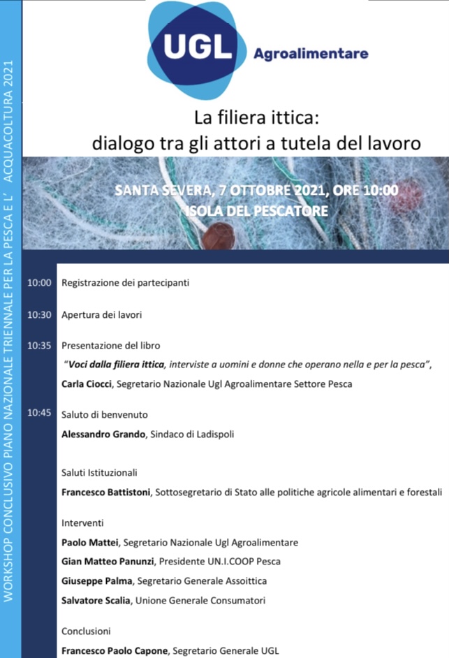 L’evento conclude il programma 2021 delle iniziative a vantaggio dei lavoratori del settore, realizzate dall’UGL Agroalimentare con il contributo del Ministero delle Politiche Agricole Alimentari e Forestali, nell’ambito del Piano nazionale triennale pesca e acquacoltura.