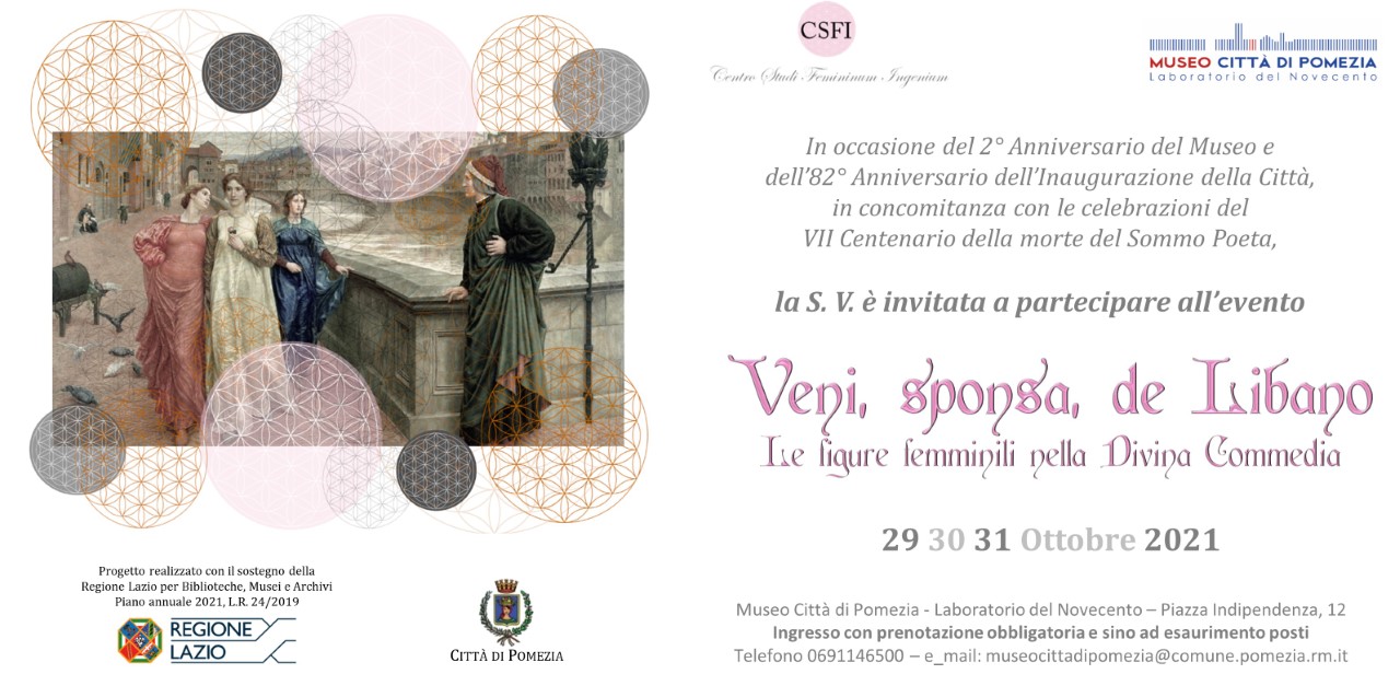 (MeridianaNotizie) Pomezia, 19 ottobre 2021 – Venerdì 29 ottobre prossimo Pomezia celebrerà l’82° anniversario dell’inaugurazione della Città e il secondo compleanno del Museo Città di Pomezia – Laboratorio del Novecento, con una tre giorni dedicata alle figure femminili della Divina Commedia di Dante, di cui si celebrano i 700 anni dalla morte. All’apertura, prevista per venerdì 29 ottobre alle ore 17.00, parteciperanno il Sindaco Adriano Zuccalà e la vice Sindaco Simona Morcellini.
