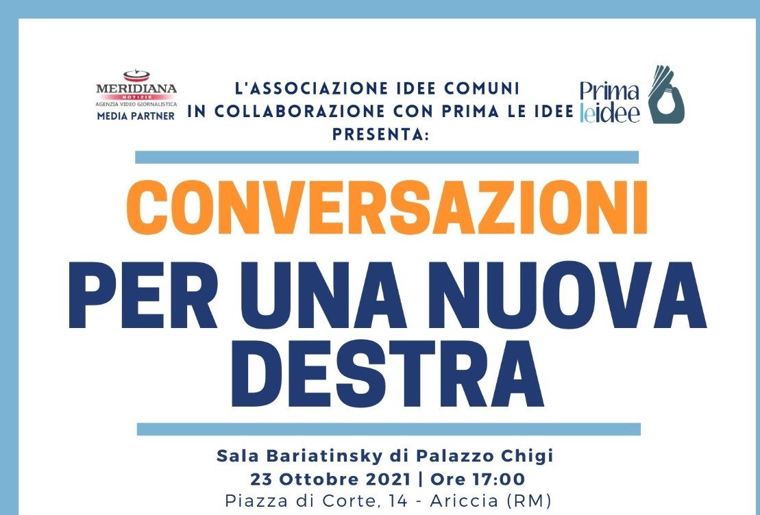 (MeridianaNotizie) Ariccia, 20 ottobre 2021 – L’Associazione di Amministratori locali “Idee Comuni” in collaborazione con “Prima le Idee” presenta un nuovo ciclo di eventi dal titolo “ConversAzioni”. Il primo appuntamento è fissato il 23 ottobre 2021 alle ore 17 ad Ariccia (RM) per la presentazione del nuovo lavoro editoriale di Daniele Capezzone “Per una nuova destra”. Nella suggestiva location di Palazzo Chigi interverranno il giornalista autore Daniele Capezzone, il Sindaco di Ariccia Gianluca Staccoli, Il presidente del Consiglio Comunale di Ariccia Michele Filosofi, il neo Consigliere Comunale di Roma Giovanni Quarzo, il direttore editoriale di Meta magazine Andrea Titti, il Capogruppo di Fratelli d’Italia in Città metropolitana Andrea Volpi e l’On. Marco Silvestroni.
