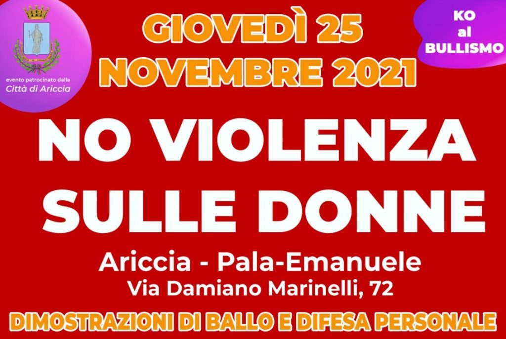 (MeridianaNotizie) Ariccia, 24 novembre 2021 – Domani, 25 novembre, si celebra la Giornata Internazionale contro la Violenza sulle Donne, numerose sono le iniziative di sensibilizzazione sul tema. Per l’occasione, ad Ariccia, l’Amministrazione comunale, con la collaborazione dell’Associazione “KO al bullismo” ha organizzato una serata di dibattito e inclusione all’interno della struttura del “Pala Emanuele”. L’evento si articola in due parti, la prima con un dibattito contro la violenza sulle donne e il bullismo al quale parteciperanno tra gli altri il Sindaco Gianluca Staccoli e Danilo Costantini Consigliere Comunale delegato allo Sport; mentre nella seconda parte della serata sono previste delle esibizioni di diversi sport femminili curati dalla società sportive del territorio.