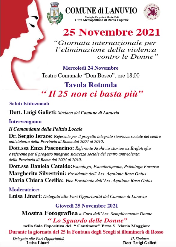 (MeridianaNotizie) Lanuvio, 21 novembre 2021 – Il Comune di Lanuvio celebra quest’anno la Giornata Internazionale per l’eliminazione della violenza contro le donne, in programma giovedì 25 novembre, con una tavola rotonda dal titolo : ” Il 25 non ci basta più” e la mostra fotografica “Lo Sguardo delle Donne” a cura dell’Ass. Semplicemente Donne che si svolgeranno rispettivamente mercoledì 24 e giovedì 25 novembre.