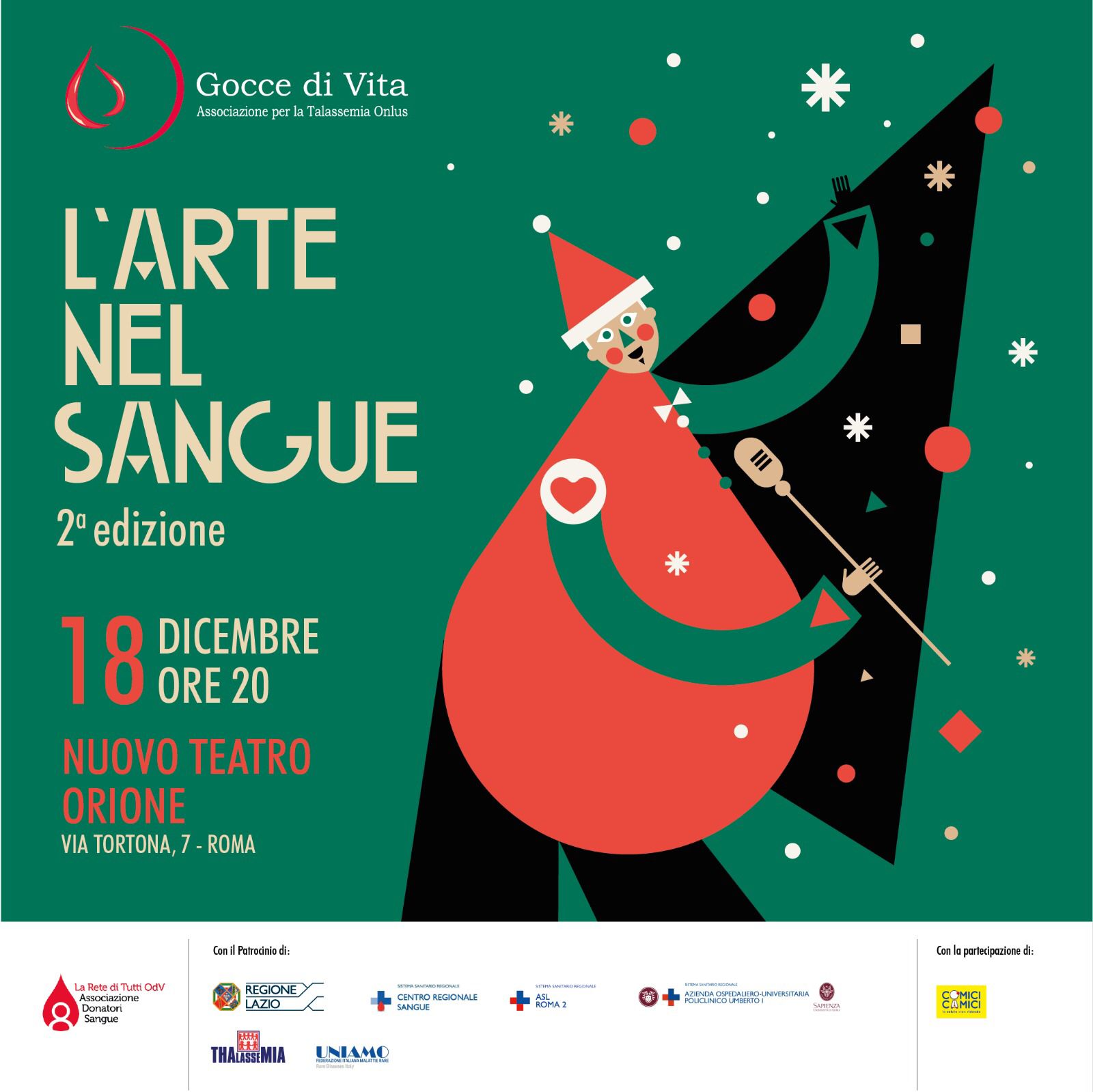 Lo spettacolo si terrà il prossimo 18 dicembre presso il Teatro Nuovo Orione – Via Tortona, 7 (Via Appia a pochi passi dalla fermata “Re di Roma” della Metro A) alle ore 20. Il costo del biglietto è di 25 euro, importo che coincide con la quota annua dell’Associazione “Gocce di vita per la talassemia”. Il ricavato ci consentirà di donare all’Ospedale S. Eugenio di Roma, centro di riferimento regionale per la cura della Talassemia, un primo strumento (Scanner venoso) che individua digitalmente i vasi sanguigni favorendo così una migliore applicazione dell’ago cannula. E ancora, creare un fondo spese che sarà messo a disposizione per l’allestimento di un nuovo reparto per la cura della talassemia presso l’ospedale Policlinico Umberto 1 di Roma, secondo centro per numero di pazienti seguiti nella Regione Lazio. Proporre, infine, il progetto de “L’arte nel sangue” su tutto il territorio nazionale, trasformandolo in un vero e proprio format, e al contempo sensibilizzare alla donazione gli studenti degli ultimi 2 anni della scuola secondaria di II grado attraverso la creazione di un format specifico. Per ulteriori informazioni su biglietti e prenotazioni, potete scrivere a: [email protected] o al numero solo WhatsApp – 349/5012880