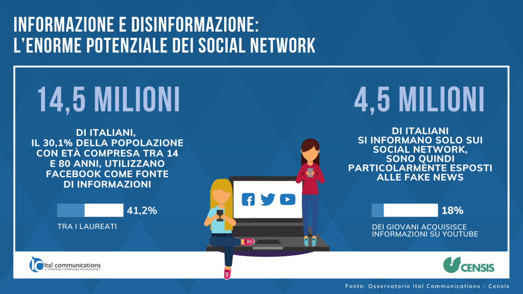 (MeridianaNotizie) Roma, 28 dicembre 2021  – È stato presentato l’Osservatorio permanente CENSIS-ITAL COMMUNICATIONS sulle Agenzie di comunicazione in Italia da cui emerge che 14 milioni e mezzo di italiani (il 30,1% dei 14-80enni) utilizzano Facebook per avere notizie, con quote che raggiungono il 41,2% tra i laureati, il 39,5% dei soggetti con età compresa fra 30 e 44 anni, il 33% delle donne. E non c’è solo Facebook: il 12,6% della popolazione acquisisce informazioni su YouTube (e la quota è del 18% tra i giovani) e il 3% su Twitter (5% tra i più giovani). In genere i social sono utilizzati in combinazione con altre fonti informative. Ci sono, tuttavia, 4 milioni e mezzo di italiani che si informano solo sui social network e che sono particolarmente esposti alle fake news, che finiscono per influenzare la loro visione del mondo e condizionarne le scelte.