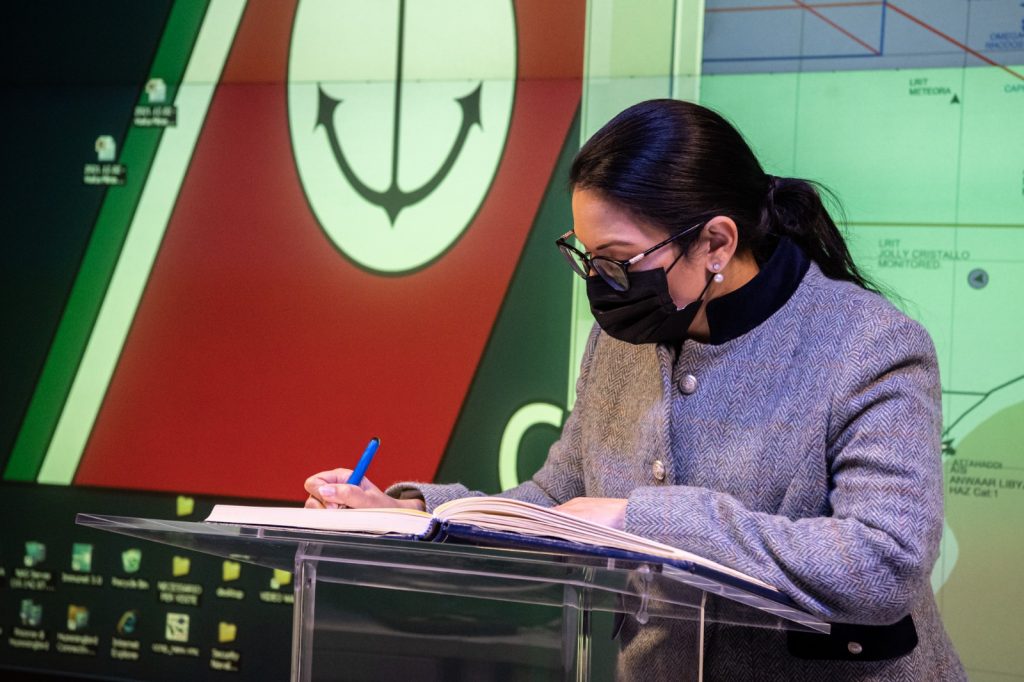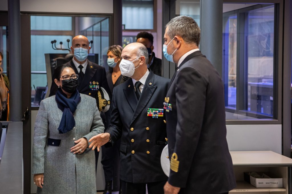 Nel pomeriggio di giovedì 2 dicembre il Ministro degli Interni (Secretary of State for the Home Department) del Regno Unito, Mrs. Priti Patel, è stata ricevuta dal Comandante Generale, Ammiraglio Ispettore Capo (CP) Nicola Carlone.Nell’occasione il Ministro ha visitato la Centrale Operativa della Guardia Costiera (Italian Maritime Rescue Coordination Centre) dove, a cura del Capo Centrale C.V. (CP) Gianluca D’Agostino, sono stati illustrati i sistemi di monitoraggio ed informazione del traffico marittimo ed è stata descritta l’organizzazione nazionale di ricerca e soccorso in mare, con particolare riferimento al ruolo del Corpo per il coordinamento delle operazioni di salvaguardia della vita umana connesse ai flussi migratori.Il Ministro, nel rivolgere il forte e sentito ringraziamento del governo britannico per la quotidiana e defatigante opera di soccorso svolta dal personale del Corpo, ha dimostrato grande interesse per le specifiche attribuzioni della Guardia Costiera, come testimoniano le numerose domande sulle attività condotte nel Mediterraneo – anche nell’ambito delle operazioni congiunte sotto l’egida dell’agenzia UE FRONTEX – e, in particolare, sulle analogie con i recenti eventi che hanno coinvolto imbarcazioni di migranti nel Canale della Manica.Al termine della visita il Comandante Generale ha offerto in dono al Ministro il tradizionale crest della Guardia Costiera
