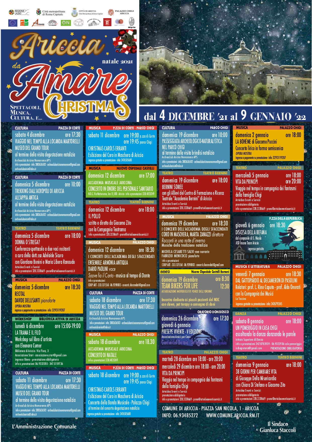 (MeridianaNotizie) Ariccia, 3 dicembre 2021 – Torna ad Ariccia l’iniziativa “Ariccia da Amare Christmas” e lo fa attraverso un ricco cartellone di eventi . A partire da domani, sabato 4 dicembre, fino a sabato 9 gennaio, la Città si animerà con appuntamenti culturali, musicali, teatrali, sociali in grado di regalare ai cittadini e agli ospiti momenti di svago e divertimento.Numerose le associazioni coinvolte nella kermesse ariccina che hanno dato l’opportunità all’Amministrazione Comunale di stilare un programma denso e variegato con proposte culturali per tutte le fasce di età e le aree di interesse.