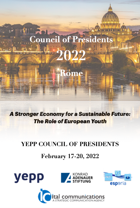 (MeridianaNotizie) Roma, 16 febbraio 2022 – Si svolgerà a Roma, dal 17 al 20 febbraio, presso il Parlamento italiano, il Council Meeting YEPP 2022 (Youth of European People’s Party), organizzato dai Giovani Leader del Partito Popolare Europeo, dal titolo “Un’economia più forte per un futuro sostenibile. Il ruolo dei giovani europei”. Gli incontri saranno l’occasione per dare voce alle istanze dei giovani e per discutere delle sfide più urgenti nell’Unione europea a partire dalla politica sanitaria e dalla crescita sostenibile.