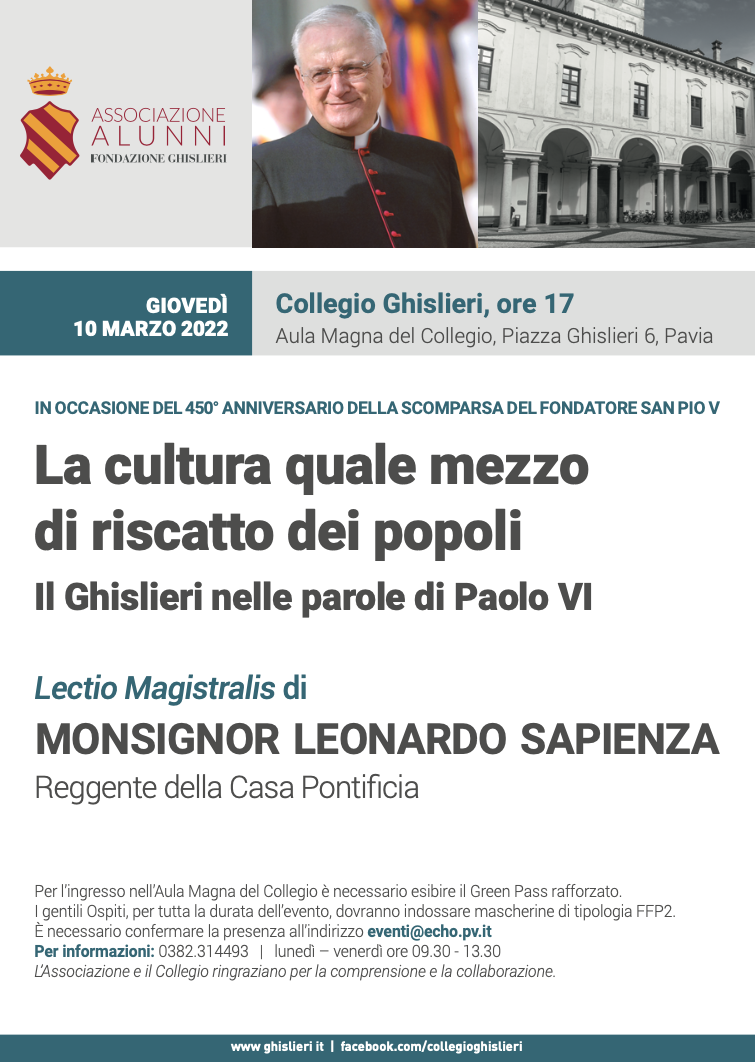 Giovedì 10 marzo 2022, alle ore 17.00, presso l’Aula Magna del Collegio Ghislieri di Pavia, Monsignor Leonardo Sapienza, Reggente della Casa Pontificia, terrà una Lectio Magistralis dal titolo “LA CULTURA QUALE MEZZO DI RISCATTO DEI POPOLI. Il Ghislieri nelle parole di Paolo VI”.
