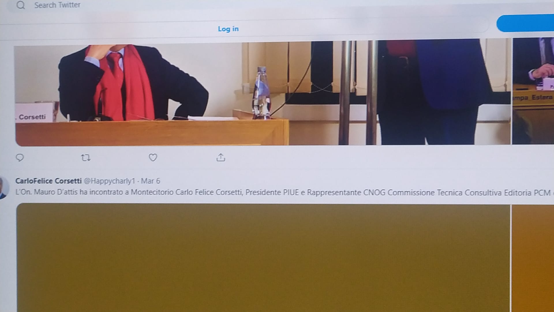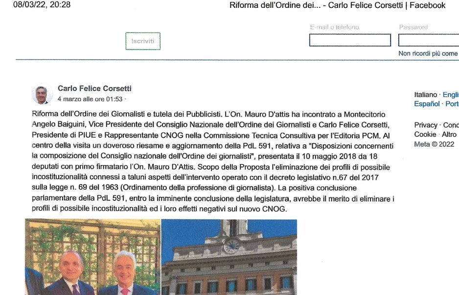 Con un post del 4 marzo sul suo profilo Facebook  il giornalista pubblicista Carlo Felice Corsetti dava conto di un incontro a Montecitorio, nella sua veste di rappresentante ufficiale dell’Ordine Nazionale dei Giornalisti Italiani. Due giorni dopo  con un tweet lo stesso  Corsetti conferma di aver partecipato alla riunione come rappresentante del Consiglio Nazionale dell’Ordine dei Giornalisti,  nella sua veste di  componente della “Commissione Tecnica Consultiva per l’Editoria presso la Presidenza del Consiglio dei Ministri”, commissione che  è  stata soppressa dal 2017.