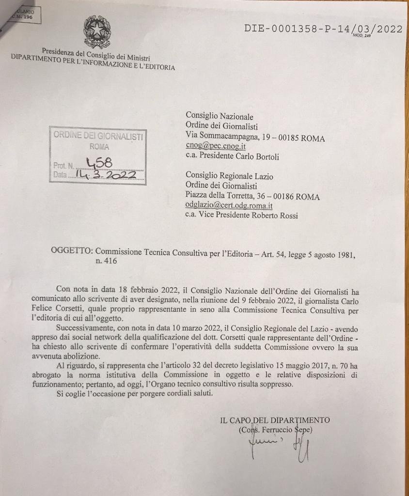 “Con note in data 18 febbraio 2022, il Consiglio Nazionale dell’Ordine dei Giornalisti ha comunicato allo scrivente di aver designato nella riunione del 9 febbraio 2022, il giornalista Carlo Felice Corsetti quale proprio rappresentante in seno alla Commissione Tecnica Consultiva per l’editoria presso la PCM di cui all’oggetto. Successivamente, con note in data 10 marzo 2022,11 Consiglio Regionale del Lazio – avendo appreso dei social network della qualificazione del dottor Corsetti quale rappresentante dell’Ordine -ha chiesto allo scrivente di confermare l’operatività della suddetta Commissione ovvero la sue avvenuta abolizione. Al riguardo, si rappresenta che l’articolo 32 del decreto legislativo 15 maggio 2017, n. 70 ha abrogate la norma istitutiva della Commissione in oggetto e le relative disposizioni di funzionamento, pertanto, ad oggi, l’Organo tecnico consultive risulta soppresso. Si coglie l’occasione per porgere cordiali saluti. IL CAPO PEL DIPARTIMENTO (Consigliere Ferruccio Sepe).