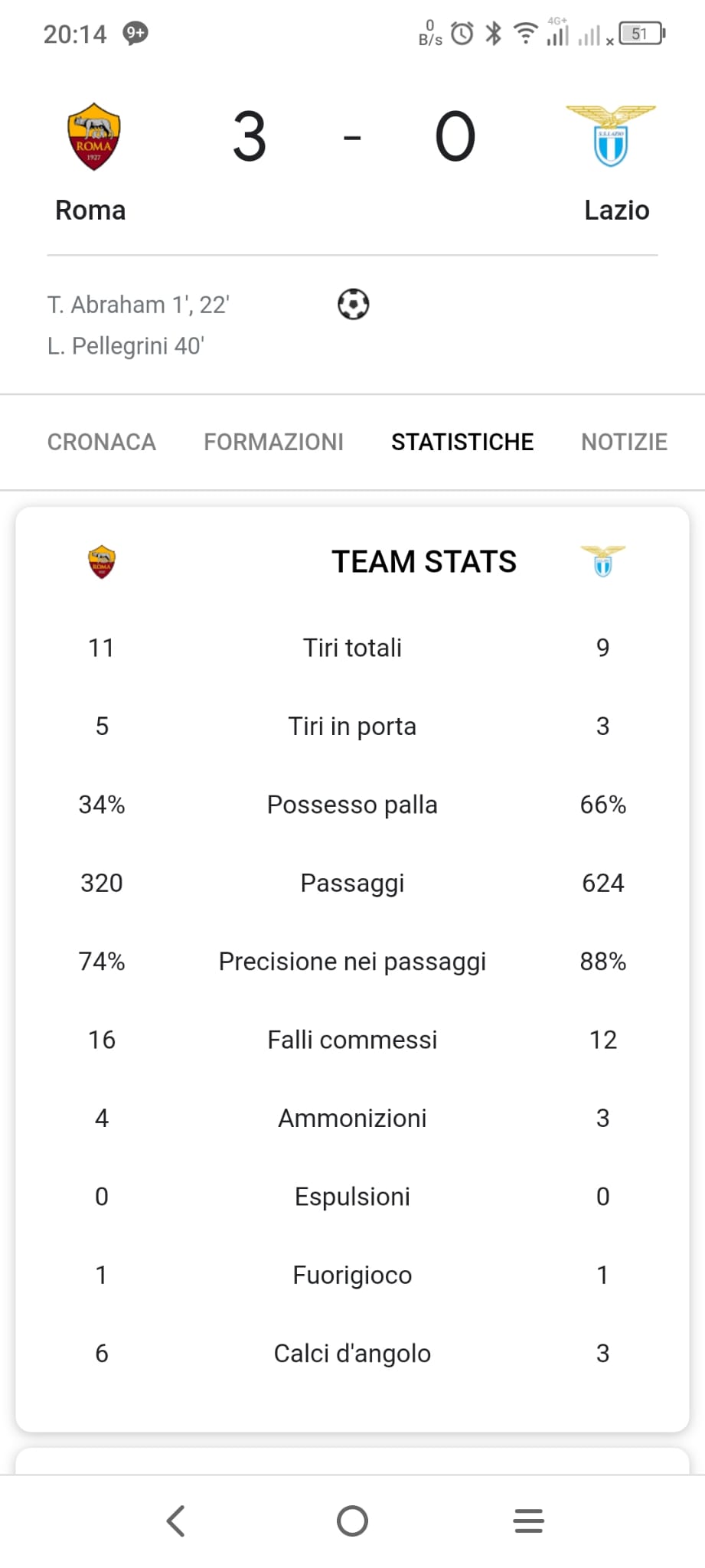 Il derby di oggi pomeriggio, se dovesse essere letto solo nei numeri statistici della gara (clicca qui), sembrerebbe essere stato piuttosto equilibrato, per cui apparirebbe quasi impossibile pensare ad una sconfitta della Lazio per tre a zero. Ma per chi ha visto la partita, la Lazio in tutto il primo tempo ha tirato solo una volta verso la porta avversaria, per il resto, il buio assoluto, mentre la Roma ha trovato la via del gol (fortuitamente, dirà qualcuno, sul primo gol…ma Abraham era lì pronto a colpire) con facilità. Il terzo gol poi, è stato un capolavoro di Pellegrini. Una punizione da fuori area calciata a giro benissimo dal romanista che ha dato un effetto a rientrare alla sfera, indirizzandola esattamente all’incrocio dei pali alla sinistra di Strakosha che si distende e tocca la palla ma non sufficientemente forte da metterla fuori. Tiro imprendibile.