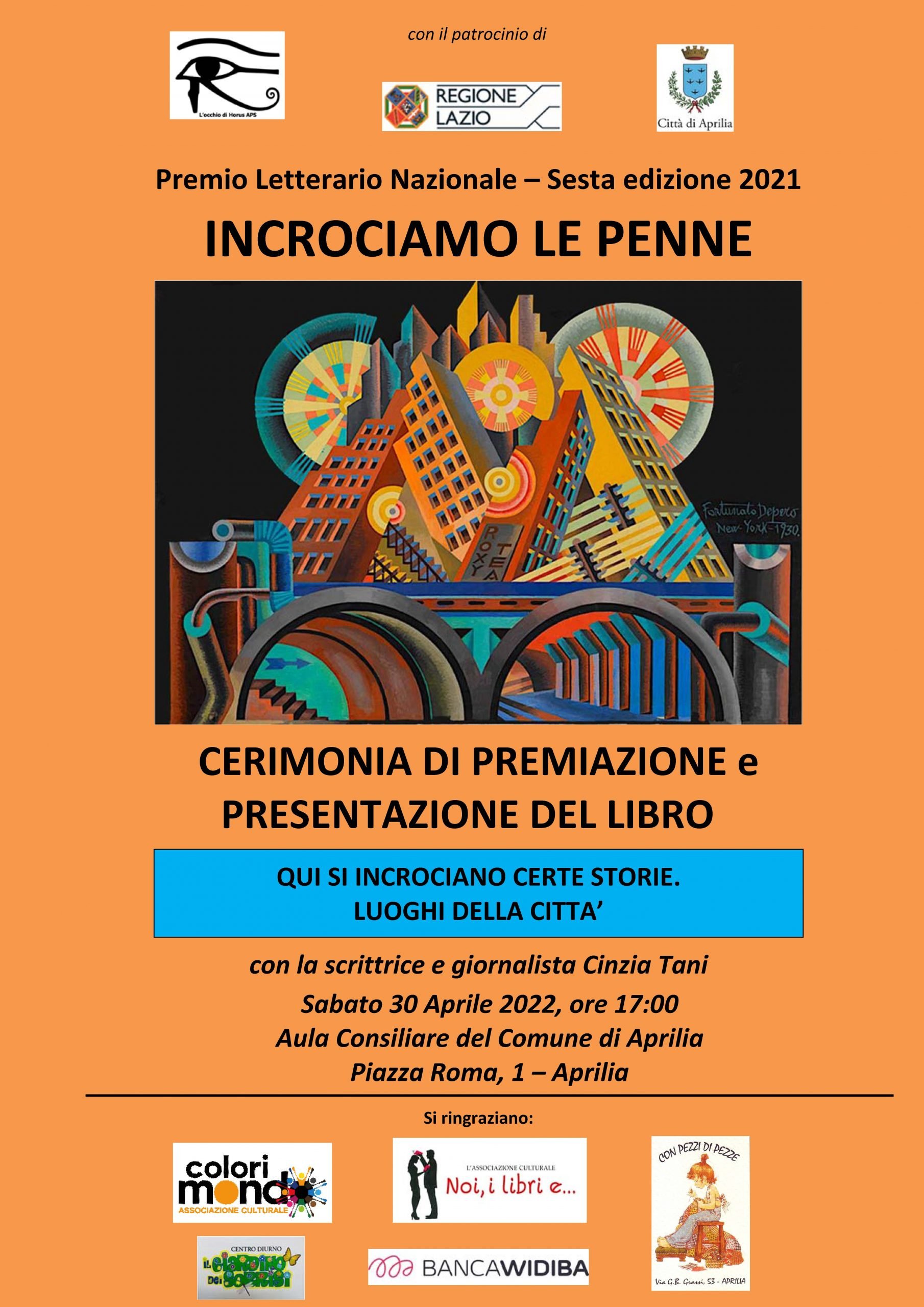 (MeridianaNotizie) Aprilia 22 aprile 2022 – Sabato 30 aprile alle ore 17:00 presso l’Aula Consiliare del Comune di Aprilia si terrà la cerimonia di premiazione del Concorso Letterario Nazionale “Incrociamo le penne”, organizzato dall’Associazione L’Occhio di Horus APS, con il patrocinio della Regione Lazio e del Comune di Aprilia.