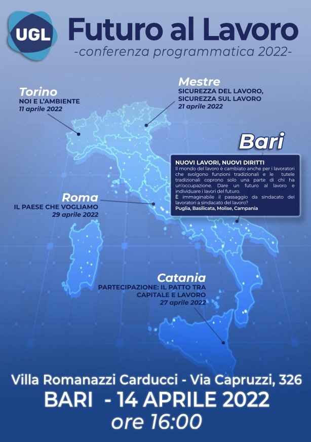 Giovedì 14 aprile, alle ore 16.00, presso Villa Romanazzi Carducci in via Capruzzi 326 a Bari, si terrà la seconda tappa del tour nazionale organizzato dall’UGL “Futuro al Lavoro – conferenza programmatica 2022” dal titolo “Nuovi lavori, nuovi diritti”, con il fine di stimolare un dibattito politico e sindacale su temi nazionali e su quelli di interesse regionale. L’obiettivo dell’incontro è quello di definire le linee programmatiche dell’azione sindacale che caratterizzeranno le prossime battaglie dell’UGL e, al contempo, raccogliere indicazioni sullo stato di salute di ogni territorio in termini economici, sociali e di lavoro.