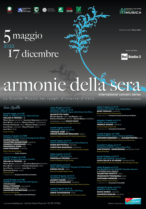 Luoghi artistici e naturalistici di straordinaria bellezza come la Cappella di Sant’Uberto di Venaria Reale, la Chiesa dello Spasimo di Palermo, Piazza Castello a Moresco, tra i borghi più belli d’Italia, e il Colle dell’Infinito, a Recanati. Musicisti acclamati come la violoncellista Silvia Chiesa, i pianisti Marcella Crudeli e Maurizio Baglini, la violinista Ksenia Milas, il soprano Valentina Varriale e astri nascenti come la pianista quindicenne Monica Zhang. Chicche musicali come l’integrale delle “Sonate” e “Partite” per violino solo di Bach ad opera della violinista armena Sonig Tchakerian e uno spettacolo dedicato a San Francesco d’Assisi con prime esecuzioni assolute di Marco Sollini. Sono queste alcune perle di “Armonie della sera” 2022, l’“International Concert Series” che quest’anno giunge al traguardo dei diciott’anni.