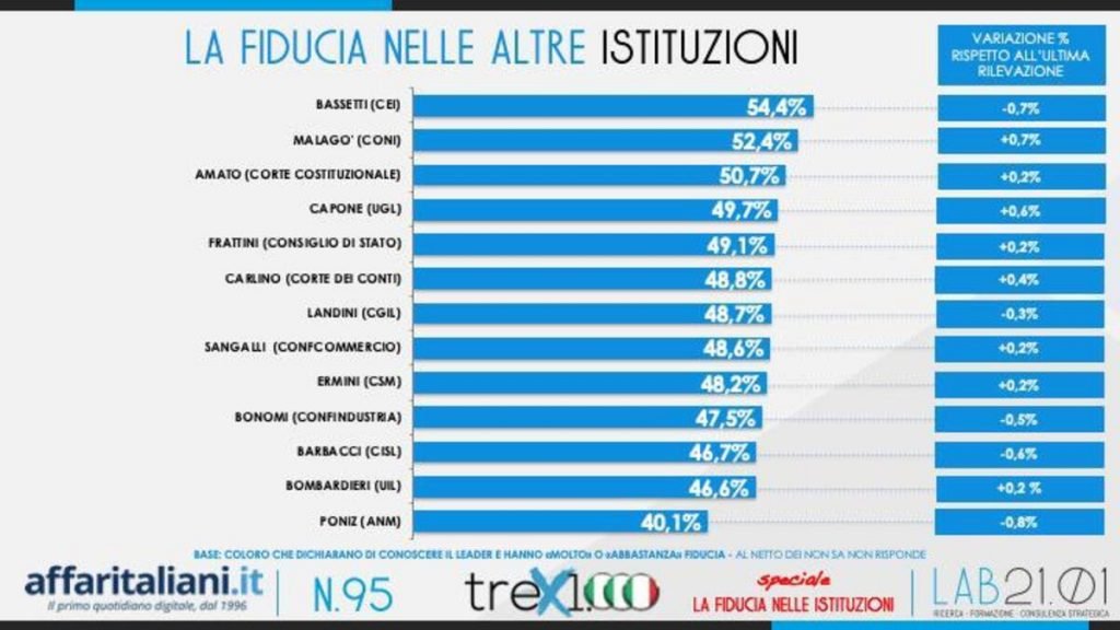 Per quanto riguarda la fiducia nelle altre istituzioni (non partiti politici o esponenti di governo) medaglia d’oro a Gualtiero Bassetti (Conferenza Episcopale Italiana), al secondo posto Giovanni Malagò (Coni) e in terza posizione Giuliano Amato (Corte Costituzionale). Interessante il dato sui sindacati: Paolo Capone (Segretario Generale dell’UGL), quarto in classifica, batte tutti gli altri: Maurizio Landini (Segretario Generale Cgil) è solo settimo. Ultimo Luca Poniz, presidente dell’Anm (Associazione Nazionale Magistrati).