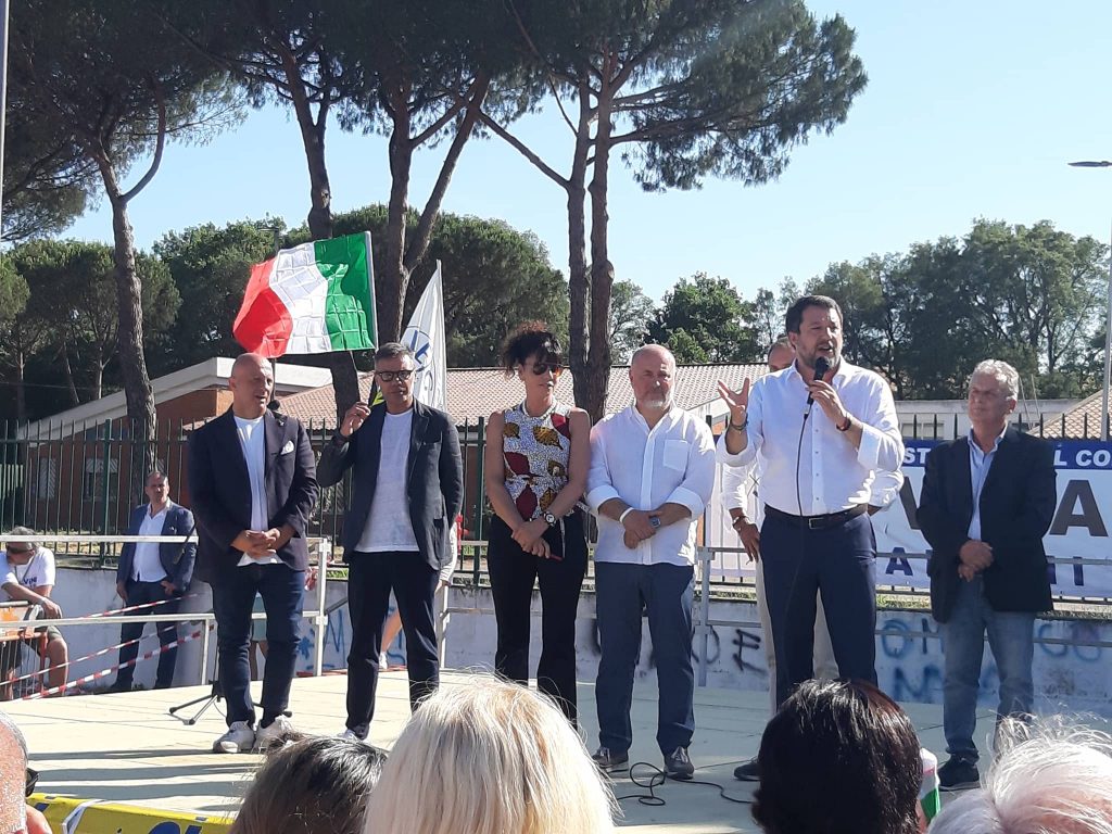 Circa cinquecento persone, si sono così riunite alle 16.30 per ascoltare il comizio del  leader del Lega nel piazzale fronte scuola media Virgilio, in via Laurentina al km 32,500 in vista dell’imminente tornata elettorale di domenica 12 giugno.