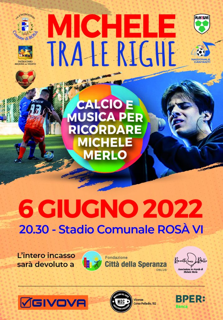 L’evento, che vanta il Patrocinio della Regione Veneto e del comune di Rosà, è realizzato con il sostegno di BPER Banca, in collaborazione con Givova, Sponsor Tecnico di Play2Give e Nazionale Italiana Cantanti, che per l’occasione vestirà anche la squadra dell’Associazione Romantico Ribelle coordinata dalla famiglia di Michele Merlo.