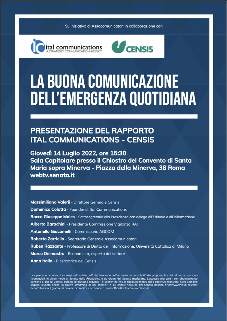 Giovedì 14 luglio, alle ore 15.30, presso la Sala Capitolare di Palazzo della Minerva del Senato della Repubblica, si terrà la presentazione del Secondo Rapporto Annuale Censis-Ital Communications sulla buona comunicazione dell’emergenza quotidiana che nasce all’interno dell’Osservatorio permanente Censis-Ital Communications sulla comunicazione e sulle agenzie di comunicazione. Al centro della Ricerca, giunta al secondo anno, il tema della domanda inedita di informazione generata dalla pandemia e dalla guerra e la necessità di prevedere regole più severe per piattaforme e social media, nonché programmi di educazione al digitale e alla comunicazione via web al fine di ridurre il rischio di imbattersi in notizie false o inesatte.