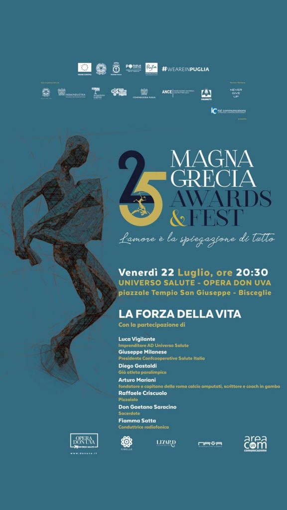 “La forza della vita” alle ore 20.30 Magna Grecia Awards & Fest 2022 palinsesto ricco di contenuti e di ospiti sempre diversi presso Opera Don Uva nel piazzale Tempio San Giuseppe a Bisceglie venerdì 22 luglio