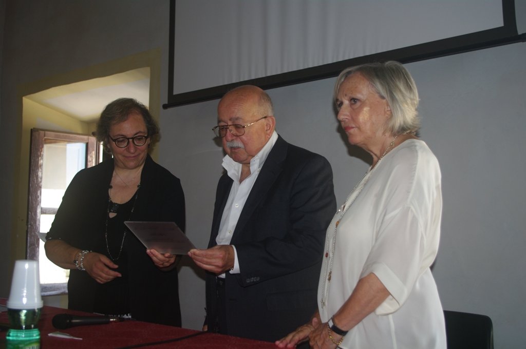 L’Assessore Michele Serafini consegna una targa di riconoscimento all’archeologa Rita Paris ospite d’onore di questa prima edizione