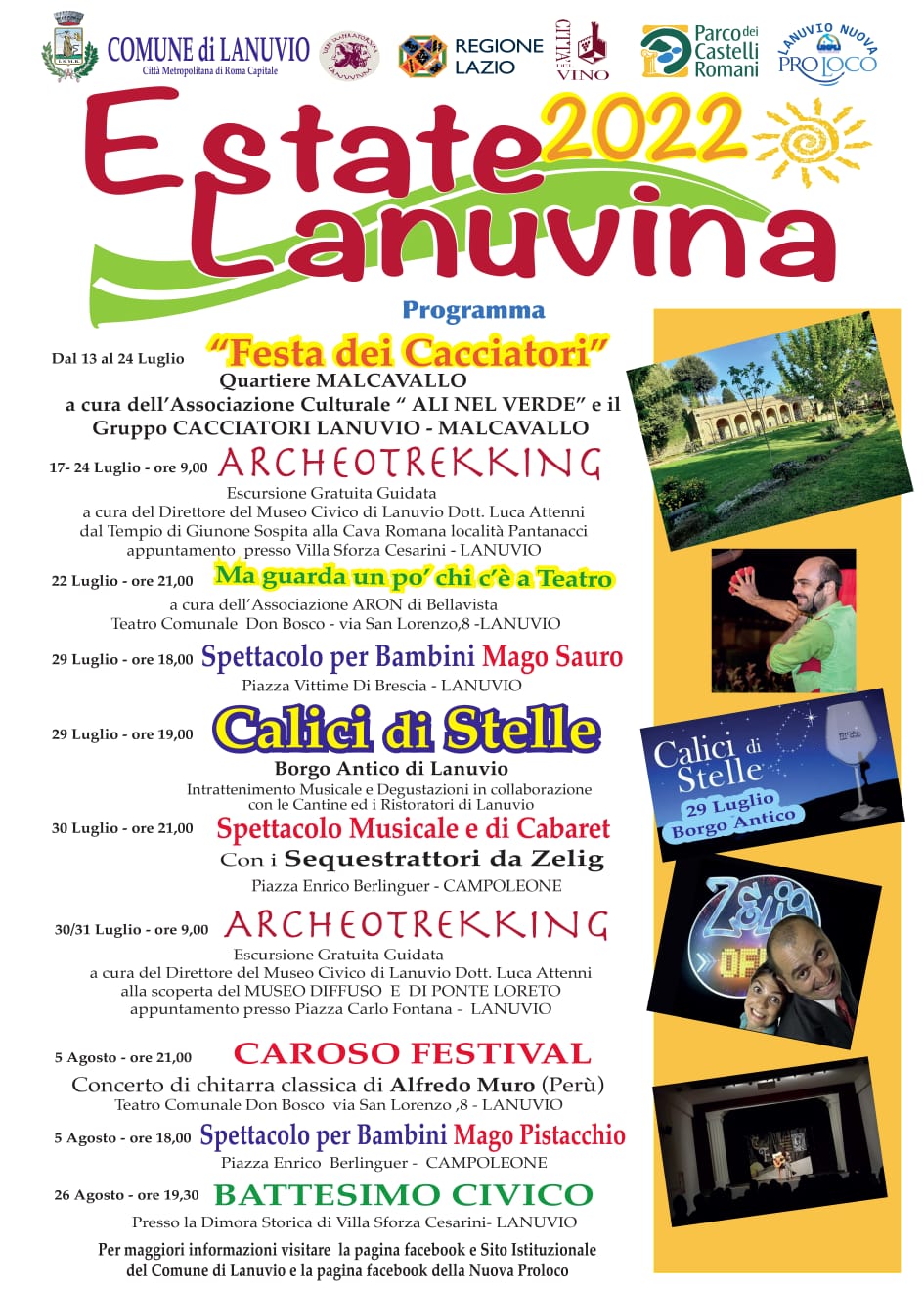“Sono soddisfatta del programma proposto – ha dichiarato Irene Quadrana Assessore agli eventi, Spettacoli e Turismo del Comune di Lanuvio – un programma pensato per tutti, dai grandi ai piccoli, all’insegna della musica del divertimento, della cultura, dell’enogastronomia e della scoperta del nostro territorio. Dal 13 al 24 nel Quartiere Malcavallo si svolgerà la “Festa dei cacciatori” a cura di due associazioni del territorio di Lanuvio. Il 17 luglio alle ore 9:00 il primo appuntamento di Archeotrekking, con escursioni gratuite guidate a cura del Direttore del Museo Civico di Lanuvio che partiranno dal tempio di Giunone Sospita fino alla cava romana dei Pantanacci. Appuntamento questo che si ripeterà anche Domenica 24 Luglio 2022. Nella serata del 22 luglio alle ore 21:00 a cura dell’associazione Aron Bellavista si svolgerà, presso il teatro comunale Don Bosco a Lanuvio, lo spettacolo “Ma guarda un po’ chi c’è a Teatro”. Il 30 e il 31 nuovo appuntamento di Archeotrekking con escursioni gratuite e guidate a cura del Direttore del Museo Civico di Lanuvio alla scoperta del Museo Diffuso di Lanuvio e di Ponte Loreto. Doppio appuntamento il 29 luglio: alle ore 18.00 presso Piazza Vittime di Brescia si svolgerà uno spettacolo per bambini e nella stessa serata dalle ore 19:00 alle ore 23:00 nell’Antico Borgo di Lanuvio si svolgerà l’evento “Calici di Stelle” curato dal vicesindaco Valeria Viglietti che ha la delega “Città del Vino”, dall’ assessorato al Turismo e dalla Lanuvio Nuova Pro Loco: un evento di enogastronomia legato ai comuni che aderiscono alla Città del Vino, per degustare il meglio delle produzioni enogastronomiche in cui protagonisti saranno i nostri vini, le nostre cantine e i nostri prodotti tipici in collaborazione con i nostri ristoratori e le cantine Lanuvine, il tutto accompagnato da un intrattenimento musicale. Il 30 luglio presso Piazza Enrico Berlinguer di Campoleone alle ore 21:00 si svolgerà lo spettacolo musicale di intrattenimento di Cabaret con i “Sequestrattori” di Zelig. Il 5 agosto al teatro Don Bosco di Lanuvio si svolgerà il “Caruso festival” con il concerto di chitarra classica di Alfredo Muro e alle ore 18:00 a Campoleone, presso Piazza Enrico Berlinguer, si svolgerà uno spettacolo per bambini. La nostra programmazione si concluderà il 26 agosto con il “Battesimo Civico” presso la dimora Storica di Villa Sforza Cesarini un appuntamento rivolto ai giovani diciottenni Lanuvini. Un’estate ricca di appuntamenti che speriamo – ha concluso Quadrana – possa soddisfare le esigenze e le aspettative di tutti i lanuvini”.