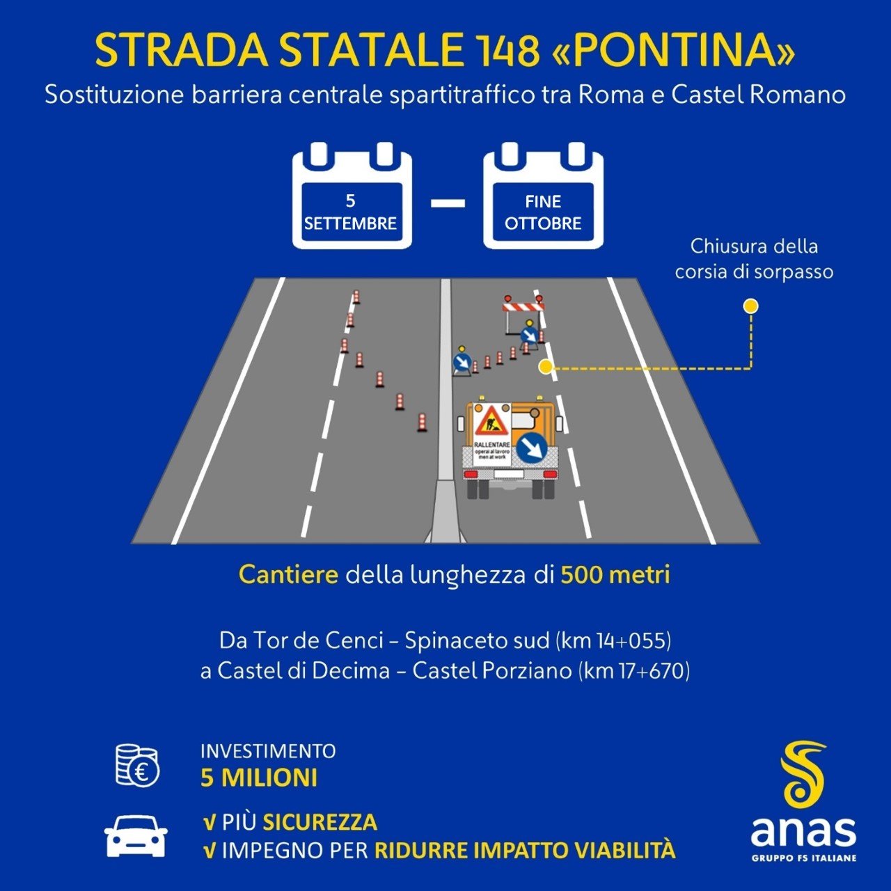 L ’intervento, che rientra nell’ambito del piano di potenziamento e riqualificazione per la strada statale 148 “Pontina”, presentato da Anas lo scorso 29 aprile 2021, ha l’obiettivo di innalzare ulteriormente i livelli di sicurezza dell’arteria interessata da elevati flussi di traffico sia in entrata che in uscita dalla Capitale.