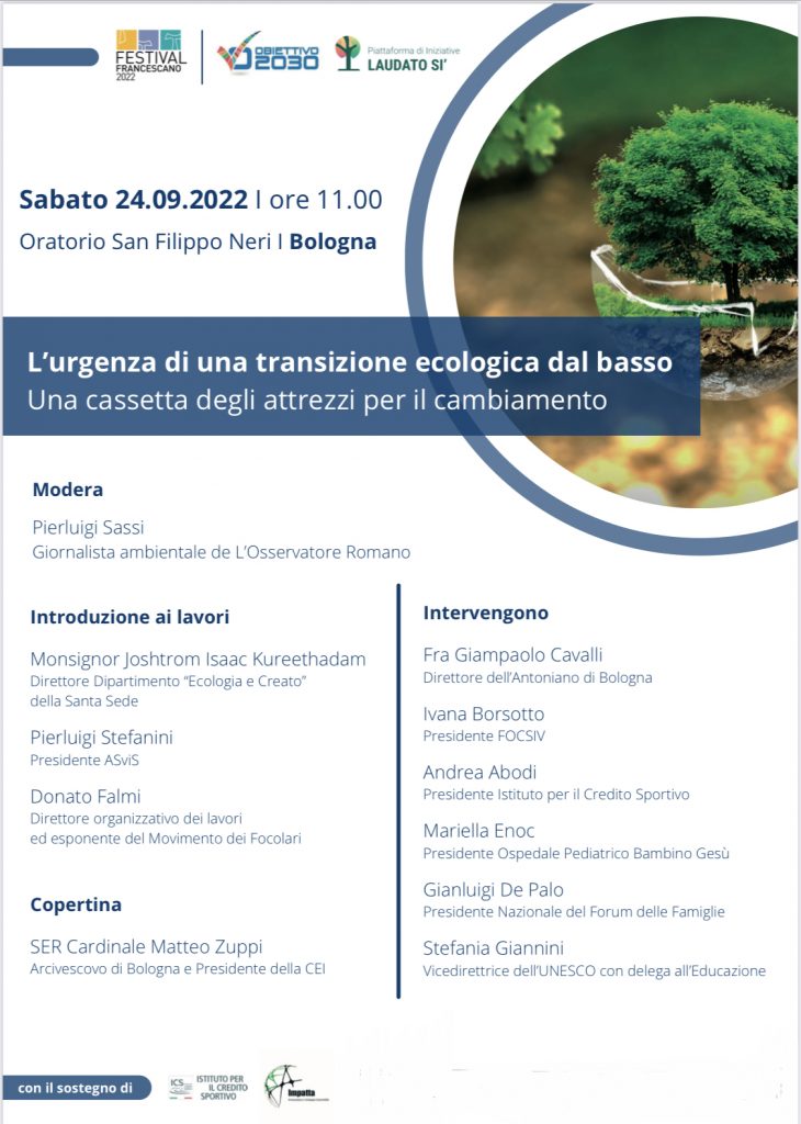Sabato 24 settembre nell’ambito del Festival Francescano, si svolgerà a Bologna presso l’oratorio San Filippo Neri, in via Manzoni, 5, a partire dalle ore 11.00, il convegno “L’urgenza di una transizione ecologica dal basso. Una cassetta degli attrezzi per il cambiamento”. Arriva da Bologna la risposta all’appello che Papa Francesco ha lanciato con la Laudato sì Action Platform a tutte le componenti della società per lavorare al raggiungimento degli obiettivi della Laudato sì e dell’Agenda 2030.