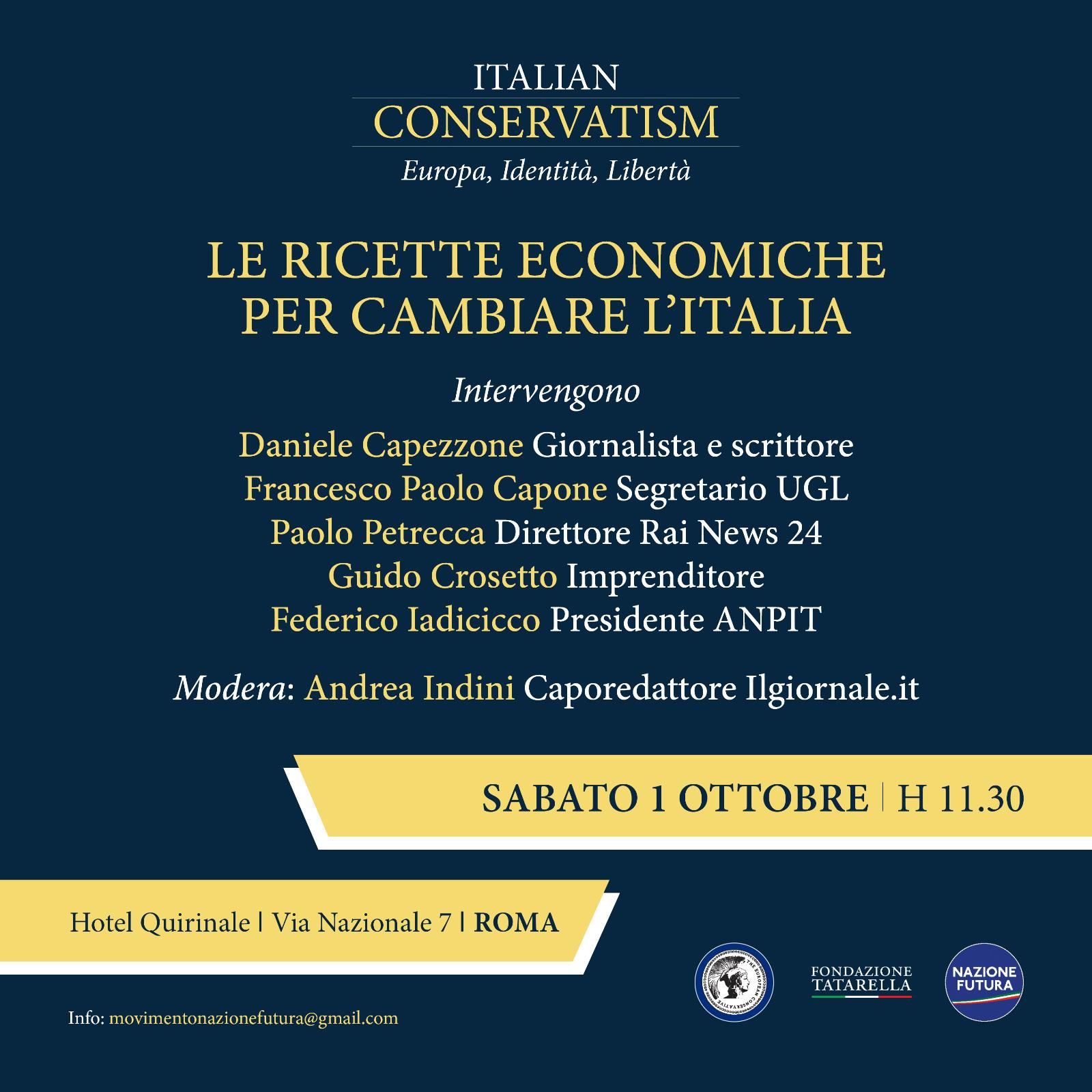 Sabato 1 ottobre alle ore 11.00, presso l’Hotel Quirinale a Roma, si terrà il convegno “Le ricette economiche per cambiare l’Italia” per discutere delle misure necessarie a rilanciare la crescita del Paese.