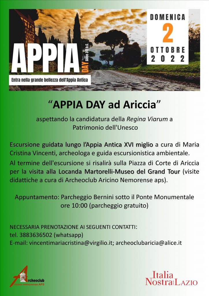 Il festival dell’Appia Antica Nasce nel 2016 grazie ad un gruppo di associazioni nazionali (https://www.appiaday.it/chi-siamo/ tra cui Touring Club Italiano e Legambiente), e del territorio tra cui Archeoclub Aricino Nemorense aps. Quest’anno dopo l’interruzione dovuta alla pandemia e si svolgerà di nuovo l’APPIA DAY da Roma a Brindisi con monumenti statali e comunali aperti, visite ed escursioni guidate, trekking, camminate, ciclotour, musica, mostre, spettacoli, rievocazioni storiche, attività per bambini, laboratori didattici, incontri itineranti. L’Appia Day è un’occasione per celebrare il fascino e l’incanto dell’Appia Antica unendo idealmente tante città e comunità locali. L’evento di Ariccia, gratuito, è patrocinato da Italia Nostra Lazio e sarà organizzato in collaborazione con l’Archeoclub Aricino Nemorense aps.