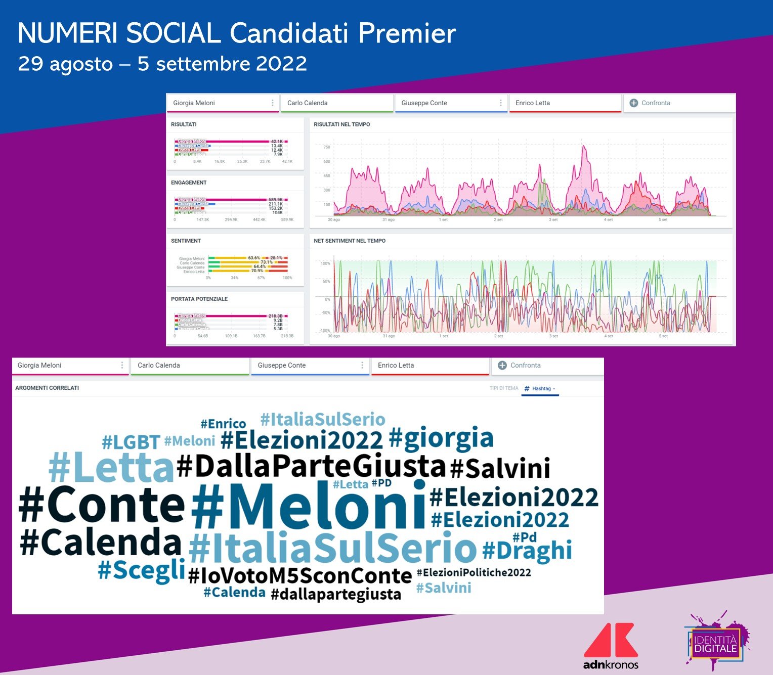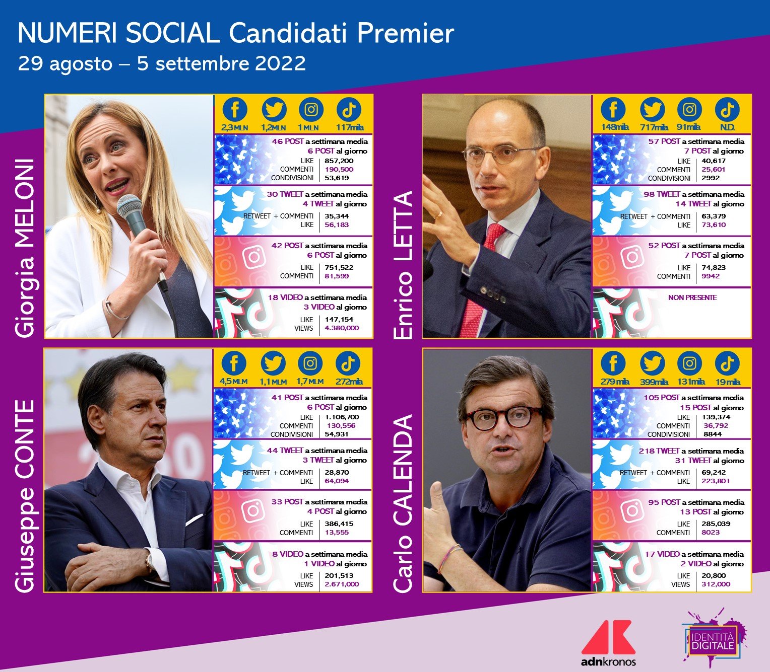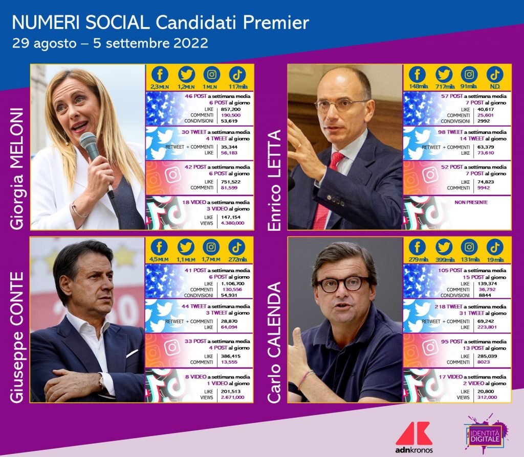 “Proseguiamo l’analisi dei 4 candidati Premier sulle varie piattaforme social – commenta Helene Pacitto, Ceo di Identità Digitale – i numeri sono molto simili a quelli della settimana scorsa in termini di pubblicazioni ed engagement; si nota sempre un Calenda disordinato e compulsivo ma pieno di grinta che posta una media di 31 tweet al giorno; un Conte che supera il milione di like complessivo sui 41 post settimanali di facebook; una Meloni che utilizza gli attacchi come armi da difesa e che mantiene una linea definita e curata raccogliendo oltre 80 mila commenti su Instagram, ed un pacato Letta che ci prova ma con un ritorno numerico nettamente inferiore agli altri 3 candidati: tanti post con poco consenso, su 57 di facebook solamente 25 mila commenti. In rete, analizzando gli hashtag #Meloni è il più citato, seguito da #Conte, #Letta e #Calenda”.