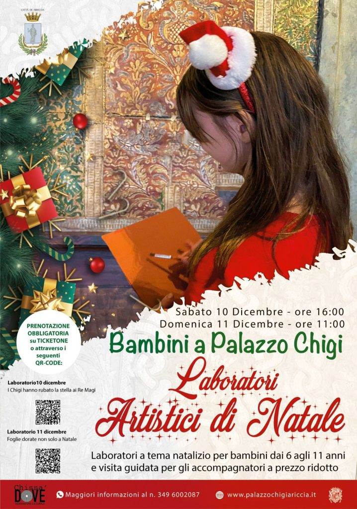 “I Laboratori, che si svolgeranno all’interno delle sale di Palazzo Chigi, sono stati studiati appositamente per far sì che i bambini realizzino le loro opere d’Arte, entrando a contatto con le nostre meraviglie artistiche e con il Natale” ha commentato Anna Lory Di Felice Consigliera Comunale con delega a Palazzo Chigi. “Mentre i bambini svolgeranno i laboratori, gli adulti accompagnatori avranno la possibilità di ammirare attraverso una visita guidata la bellezza delle sale, completamente arredate e in ottime condizioni decorative, del Palazzo progettato dal grande Gian Lorenzo Bernini. Palazzo Chigi – ha concluso la Di Felice – è sempre più il centro delle iniziative culturali e turistiche della nostra città e aprirlo ai bambini è un modo per farli sentire parte di una comunità territoriale ricca di arte e di storia”.